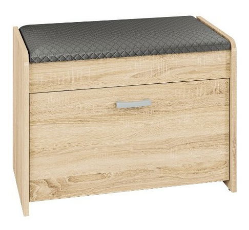 Pántos ajtóval és kárpitozott üléssel ellátott cipőtartó.