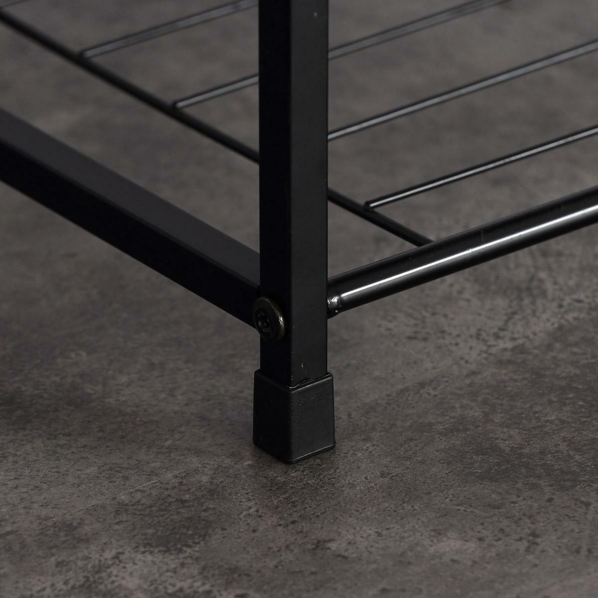 MutasdCipőszekrény könnyűfém szerkezettel és polcokkal, fekete színben. Az alap MDF lapból készült, 3D fóliabevonattal, sonoma tölgy árnyalatban.