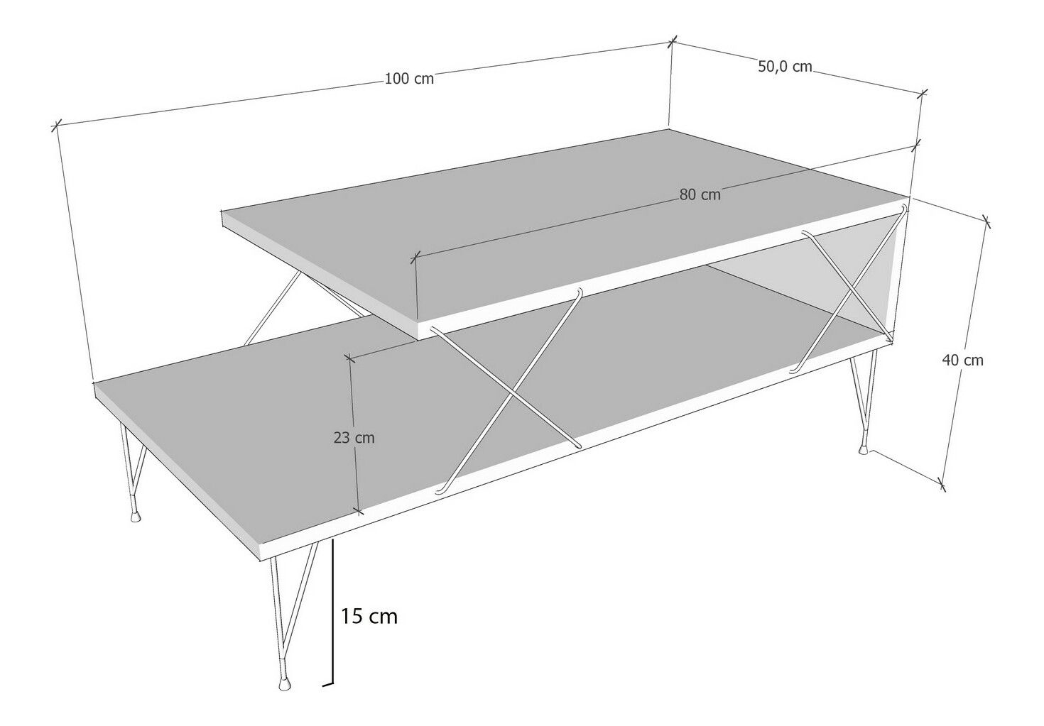 vastagság: 18 mm, fém lábak, szélesség: 100 cm, magasság: 40 cm, mélység: 50 cm, polc magassága: 23 cm, lábak magassága: 15 cm