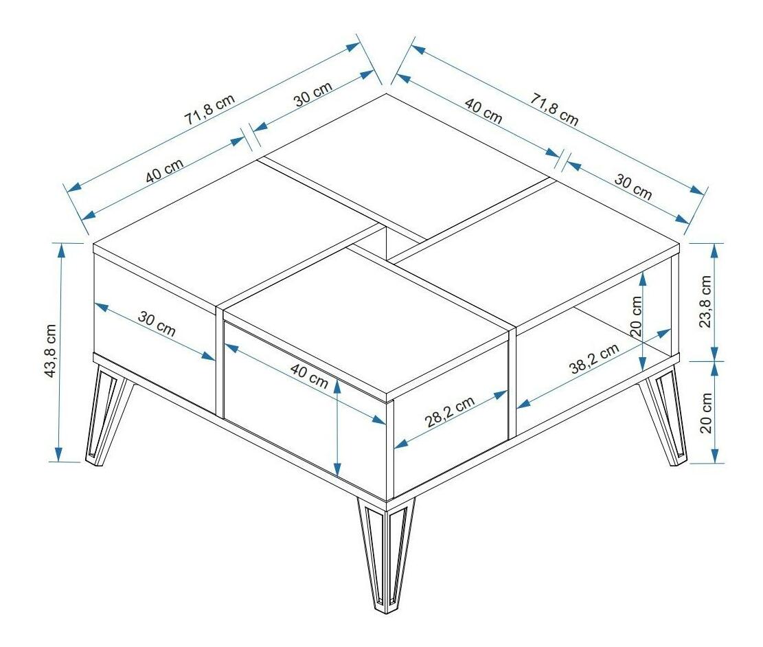 vastagság: 18 mm, szélesség: 71,8 cm, magasság: 43,8 cm, mélység: 71,8 cm, műanyag lábak, lábak magassága: 20 cm