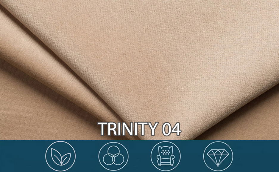 A Trinity szövet 100% poliészter szintetikus szövet, puha, tartós és erős, látható rostszerkezet nélkül. Korlátozott felszívódású, és ellenáll a foltosodásnak. Kezelje speciális termékekkel és puha kendővel, ne használjon sok vizet és fehérítőszert.