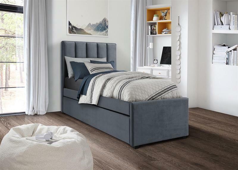 Az összecsukható kárpitozott ágy praktikus és stílusos megoldás látogatásokhoz vagy kisebb lakhatásokhoz. Laminált lapból készült, amely garantálja a stabilitást és a hosszú távú tartósságot. Az ágy felületét puha bársony anyag borítja, mely fényűző és kellemes tapintást kölcsönöz. Az ágy ugyan nem tartalmaz integrált tárolóhelyet, de a kihúzható ágynak köszönhetően kitűnik multifunkcionalitásával, amely további hálóhelyet biztosít további bútorok nélkül. A főágy léccel van felszerelve, de matrac nélkül, ami lehetővé teszi a felhasználók számára, hogy az ágyat az egyéni alvásigények szerint szabják a 200x90 cm-es ajánlott matracmérettel. Az 50 cm-es ülésmagasság kényelmes használatot biztosít a mindennapi életben.