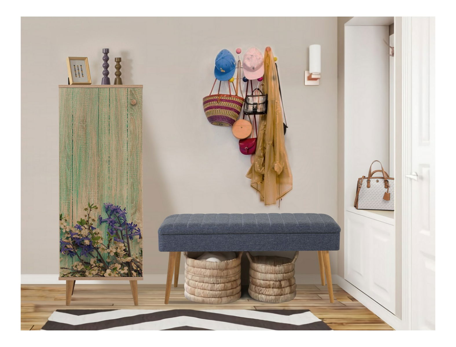 Vastagság: 18 mm. Fa lábak. Cipősszekrény: Szélesség: 50 cm. Magasság: 135 cm. Mélység: 38 cm. (1 db.) Pad méretei: Szélesség: 105 cm. Magasság: 50 cm. Mélység: 40 cm