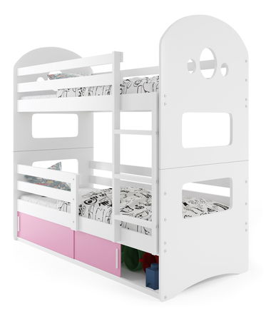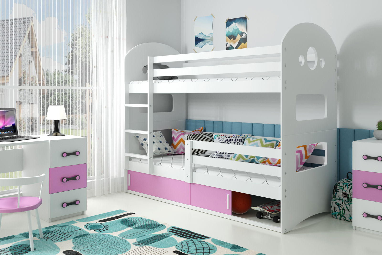 Emeletes ágy 80 x 190 cm Domur (fehér + rózsaszín) (ágyrácsokkal és tárolóhellyel)