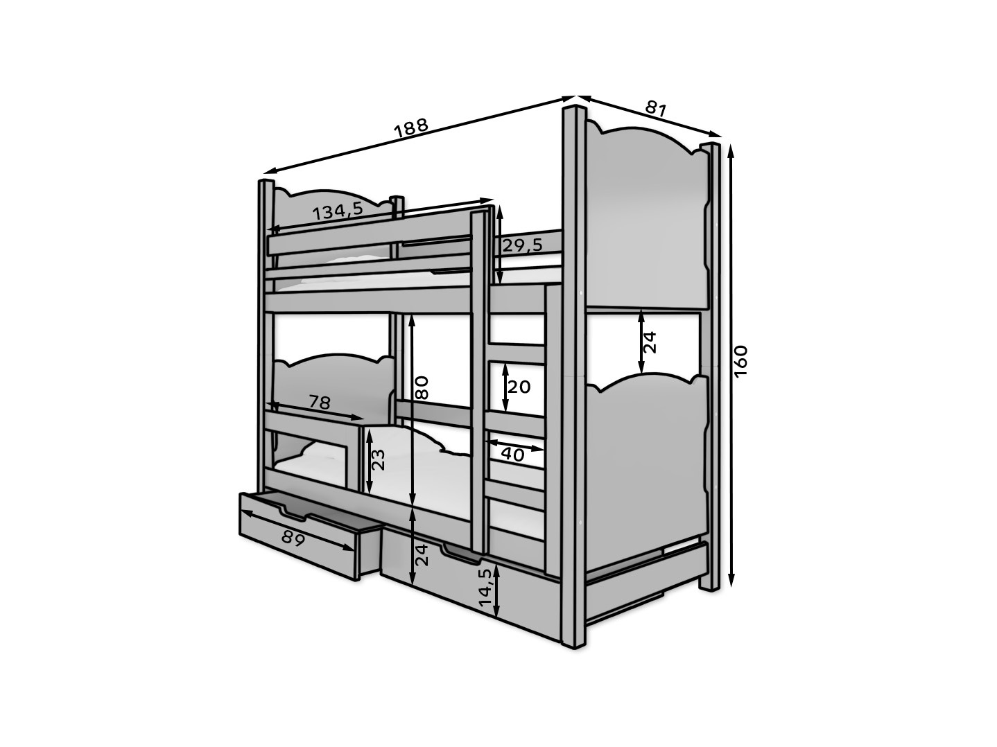 fenyőfa, az ágy közepe és a fiókok frontja MDF-ből készült