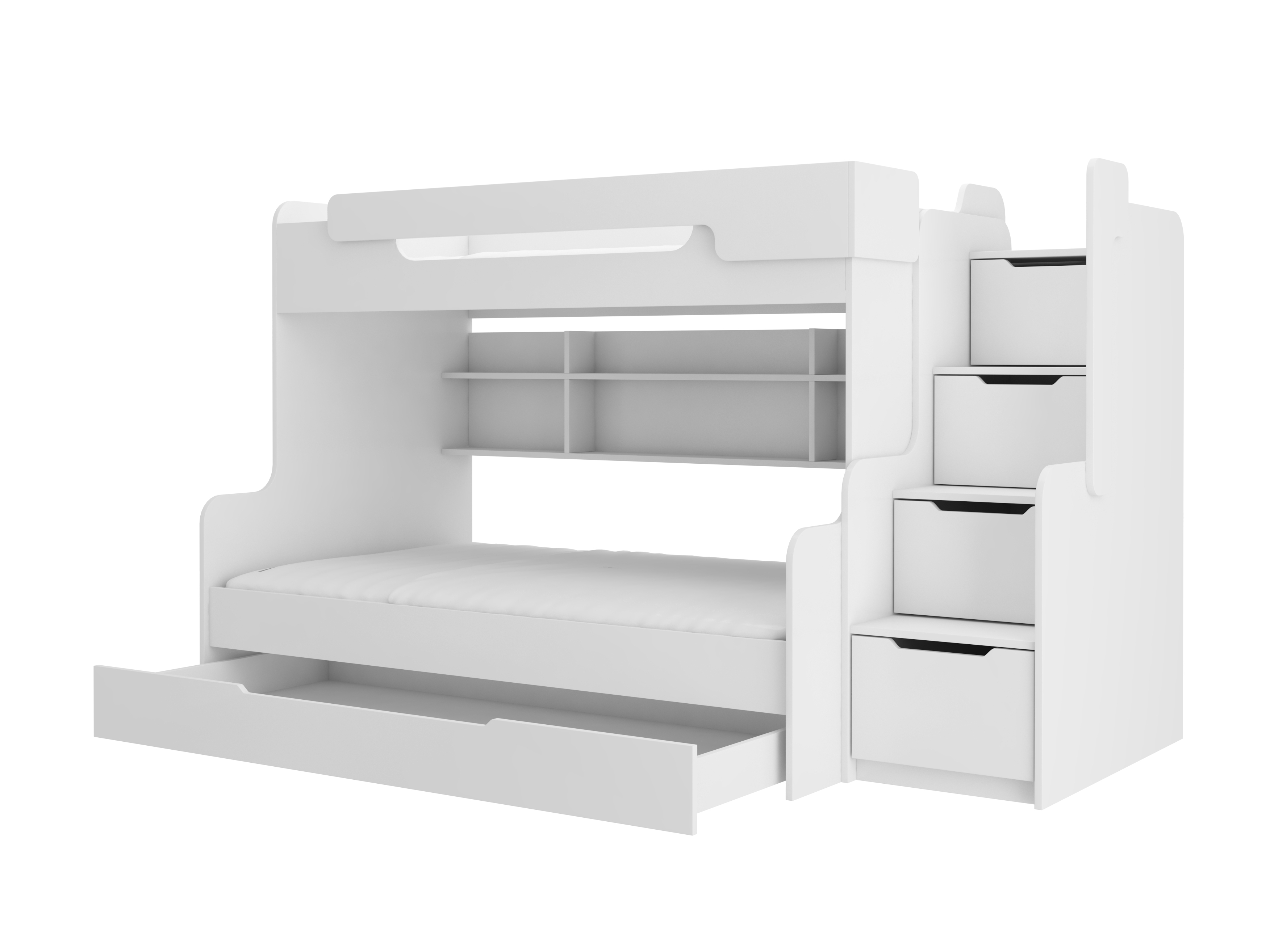 Igen, 1x kihúzható fiók, oldalsó lépcsőfokok tárolóhelyekkel és polcrendszer az alsó ágy felett