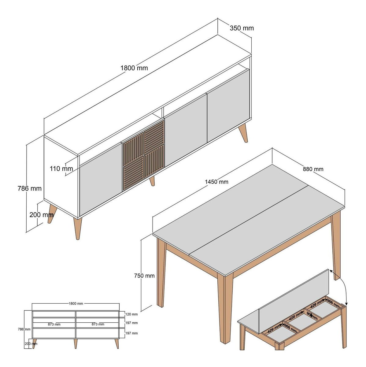 Vastagság: 18 mm. Műanyag lábak. Komód méretei: Szélesség: 180 cm. Magasság: 78,6 cm. Mélység: 35 cm. Komód lábainak magassága: 20 cm. Asztal méretei: Szélesség: 145 cm. Magasság: 75 cm. Mélység: 88 cm. Tárolóhely méretei: 42,9 cm. Magasság: 9 cm
