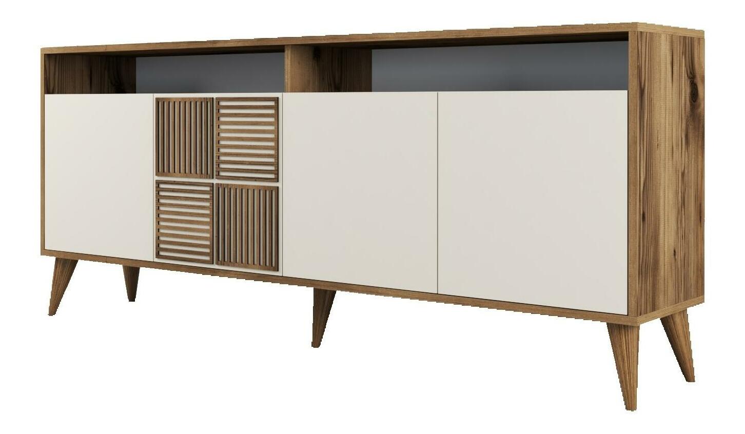 Vastagság: 18 mm. Műanyag lábak. Komód méretei: Szélesség: 180 cm. Magasság: 78,6 cm. Mélység: 35 cm. Komód lábainak magassága: 20 cm. Asztal méretei: Szélesség: 145 cm. Magasság: 75 cm. Mélység: 88 cm. Tárolóhely méretei: 42,9 cm. Magasság: 9 cm