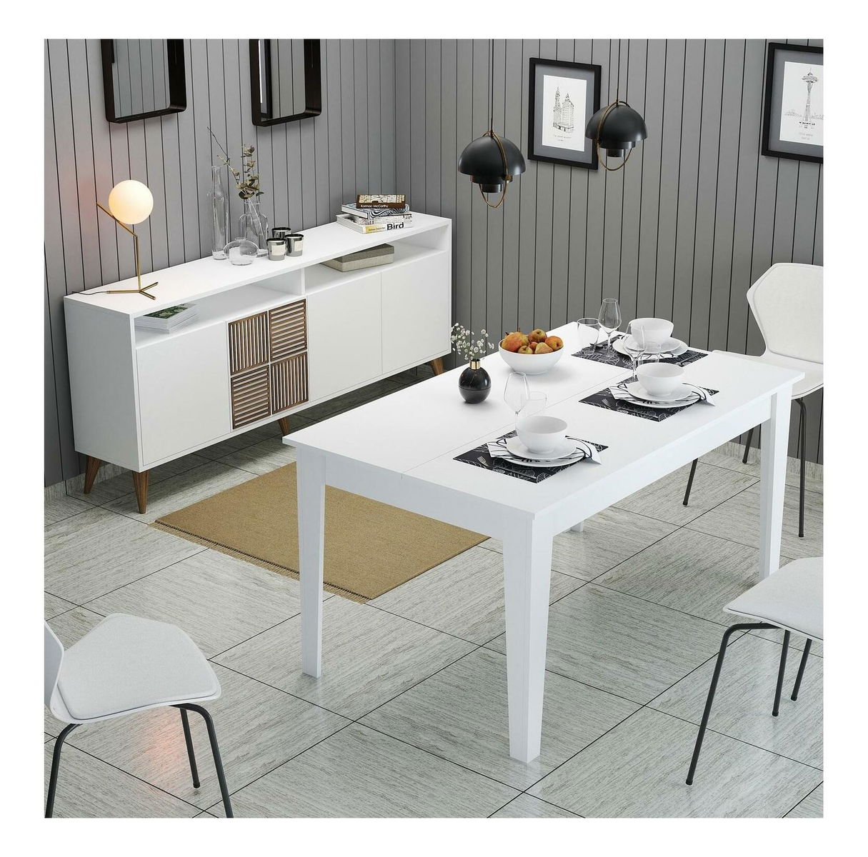 Vastagság: 18 mm. Műanyag lábak. Komód méretei: Szélesség: 180 cm. Magasság: 78,6 cm. Mélység: 35 cm. Komód lábainak magassága: 20 cm. Asztal méretei: Szélesség: 145 cm. Magasság: 75 cm. Mélység: 88 cm. Tárolóhely méretei: 42,9 cm. Magasság: 9 cm