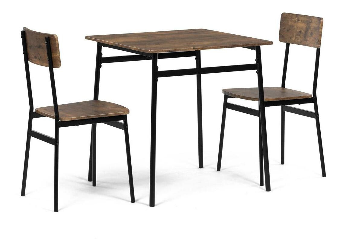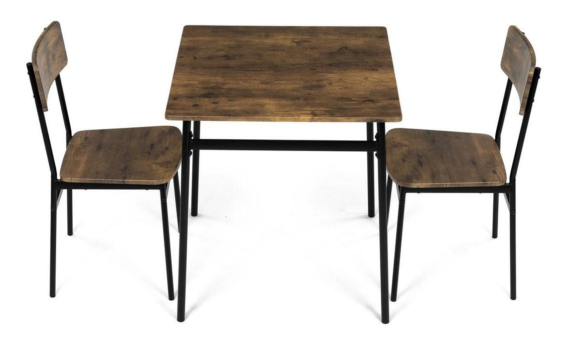 MutasdEz az étkezőgarnitúra ideális választás kisebb helyiségekbe. A szett egy négyzet alakú asztalt és két széket tartalmaz, amelyek ipari formatervezésükkel tökéletesen illeszkednek a modern enteriőrökbe. Az asztallap és az ülőkék tartós MDF-ből készültek, régi fa díszítéssel, ami rusztikus hangulatot kölcsönöz. A fekete fém lábak stabilitást és modern kontrasztot kölcsönöznek a szettnek. Ez a szett két személy számára ideális, és különösen alkalmas kisebb étkezőkbe vagy konyhákba.