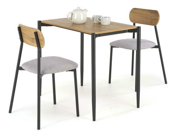 Ennek a szettnek a minimalista dizájnja a felső természetes fa finom kombinációjával és a fekete lábakkal olyan esztétikus kompozíciót hoz létre, amely könnyedén illeszkedik bármilyen belső térbe. A készlet funkcionalitása ideális megoldást kínál kis konyhákba és hangulatos étkezőkbe egyaránt. A fekete fémvázas Nanda székek garantálják a stabilitást és a tartósságot. A puha szürke kárpitozású háttámla és ülés egyedi karaktert kölcsönöz nekik, ugyanakkor kényelmet biztosít az asztalnál töltött hosszú órákon keresztül.