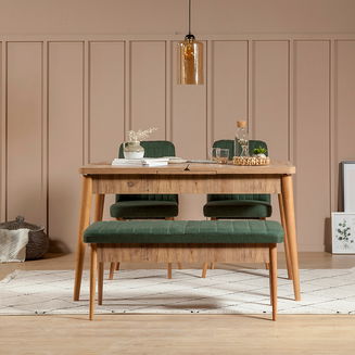 A széthúzható étkezőgarnitúrák az étkezőasztalon és a székeken kívül más, azonos kialakítású bútorokat is tartalmaznak. Ha egységes stílusban szeretné berendezni étkezőjét, a bővített étkezőgarnitúrák nagyban leegyszerűsítik a munkáját. Belátása szerint hozzáillő komódot, vitrint, polcot vagy tükröt szerelhet a szobába.