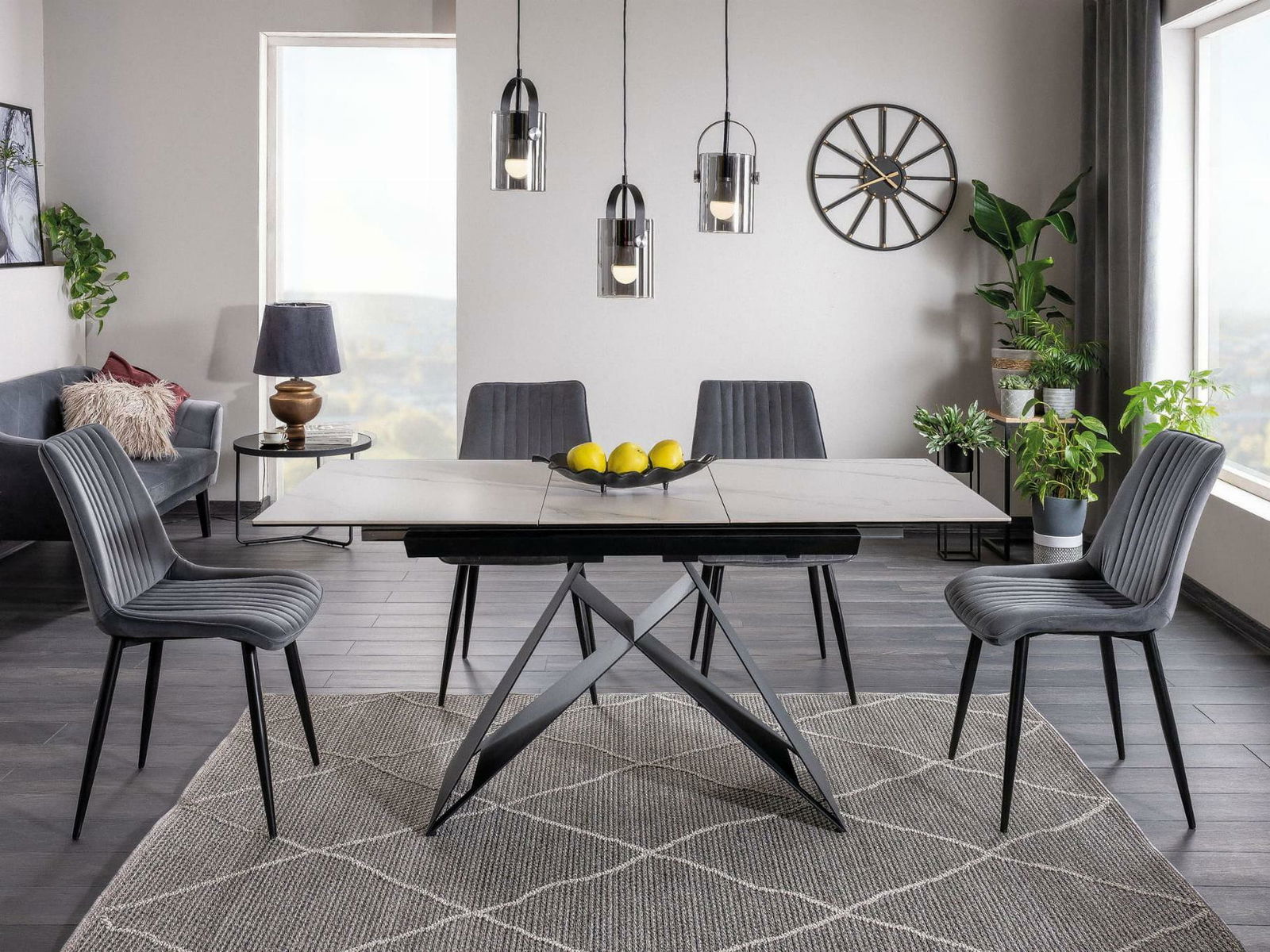 A Wallace 1 étkező, fekete, fehér márvány és szürke kombinációjában, rendkívül elegánsnak és modernnek tűnik. A Wallace kihúzható asztal (160–240 cm) stílusos talpával és 6-8 fő számára elegendő tágas helyével lenyűgöző. Négy Kelly étkezőszék szürke kárpitozással és fekete fém lábakkal kényelmet és ízléses kontrasztot kínál. Ez a szett ideális olyan dizájnnal összehangolt belső terekbe, ahol a hangsúly a részleteken és a funkcionalitáson van.
