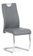 Modern étkezőszék díszesen varrott háttámlával, szürke műbőrrel kárpitozva. A krómozott fogantyú és a hintaláb kör keresztmetszetű. Az alap enyhe hajlításának köszönhetően a szék súlypontja hátrébb tolódik, így a szék kevésbé hajlamos az előrebillenésre. Az enyhe hajlítás esztétikai funkciót is betölt, mivel ez egy valóban kevésbé hagyományos kialakítás. A praktikus fogantyúnak köszönhetően a szék könnyen kezelhető, és karbantartása is egyszerű. Teherbírás akár 110 kg.