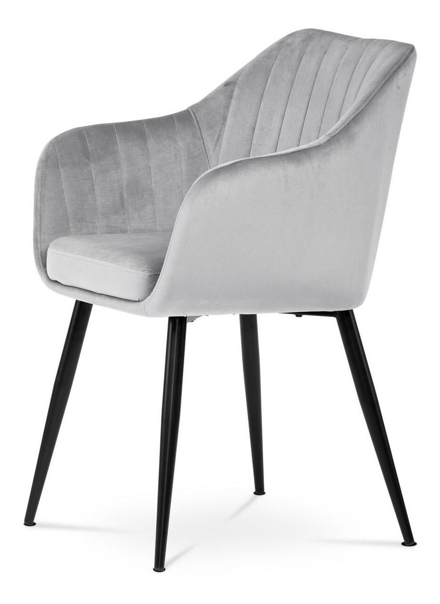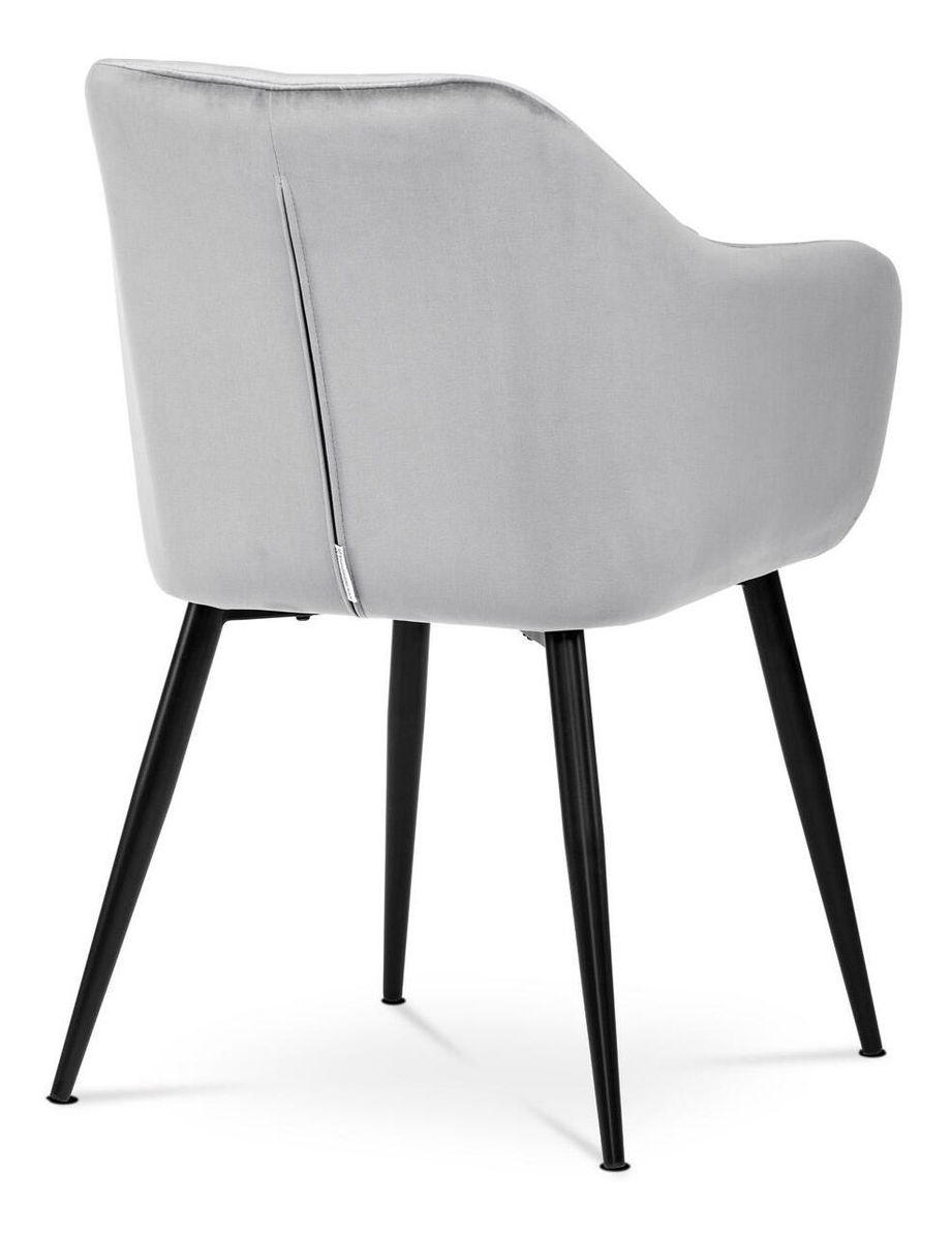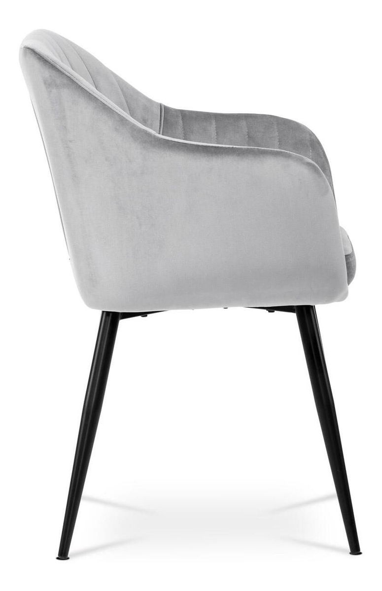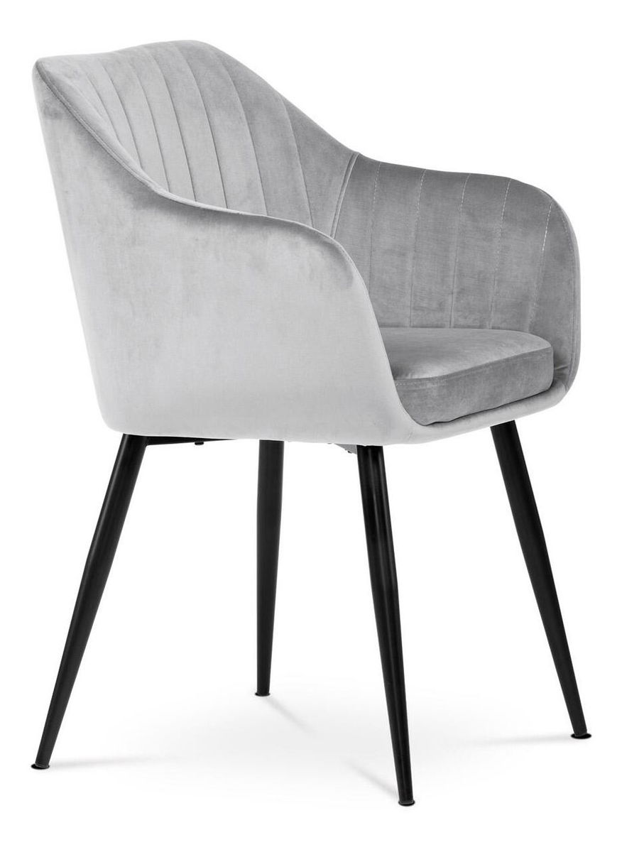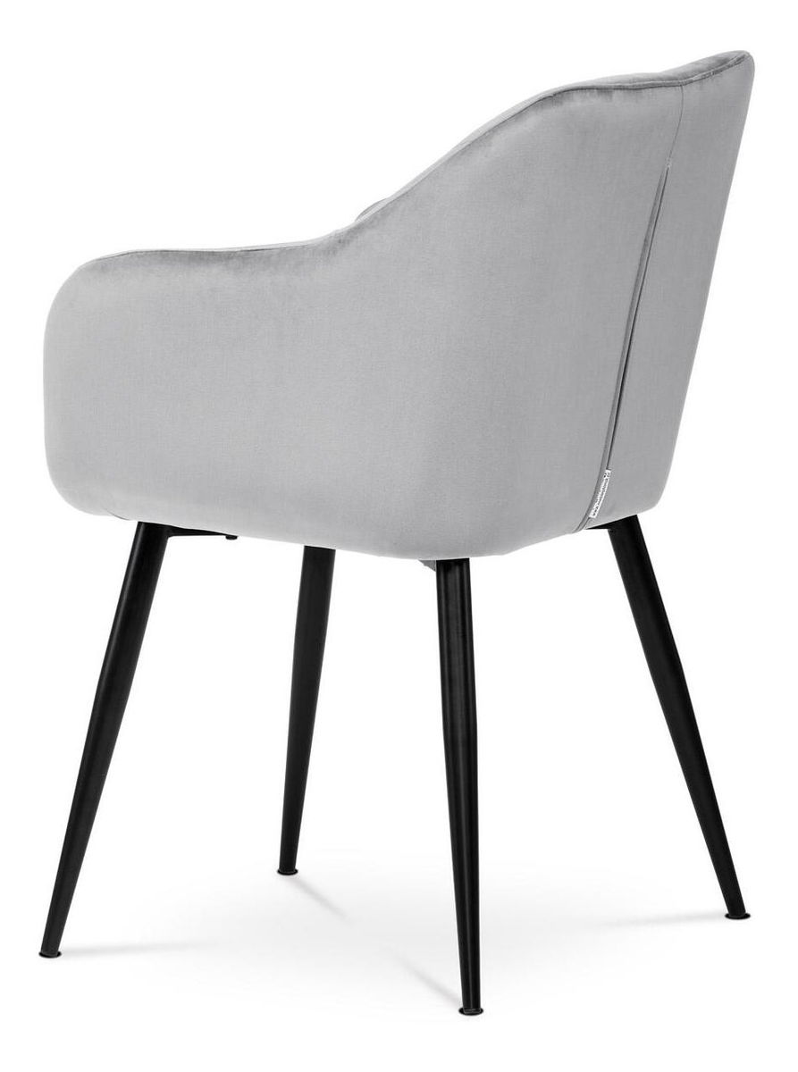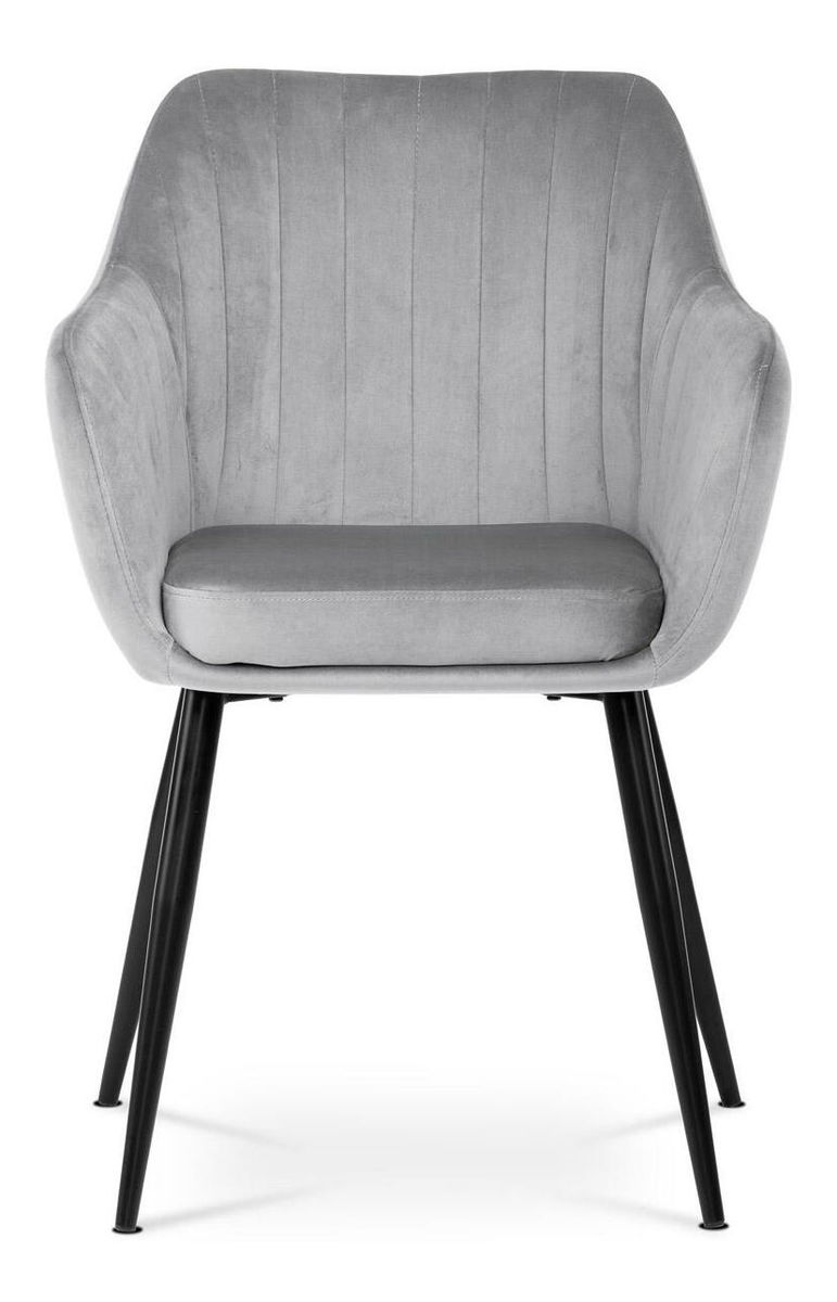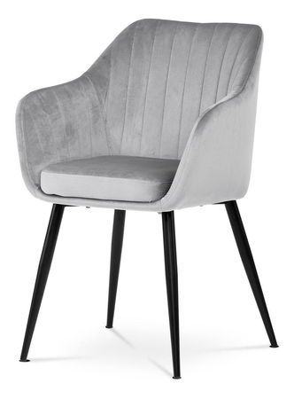 MutasdTökéletes dizájn, ipari stílus és tökéletes kényelem jellemzi ezt a széket. Az ülőfelület és a háttámla masszív fém vázzal rendelkezik, melyet kiváló minőségű, matt felületű, divatos ezüst árnyalatú bársonyszövet borít. A párnázás PU habból készült. A kényelmes ülést további bónuszként szolgál a 8 cm-rel megemelt és extra párnázott ülőfelület, valamint a praktikus, kényelmes karfák, amelyek 69 cm magasságban helyezkednek el a padlótól. Kellemes díszítőelemet képeznek a háttámla és az oldalak belső részeinek függőleges varrásai. A felhasznált szövet nagyon tartós és tökéletesen tisztítható. A szék stabilitását négy kúpos fémláb biztosítja, amelyek kiváló minőségű, matt fekete porfestékkel vannak bevonva. Fekete műanyag csúszkákkal vannak ellátva, amelyek megakadályozzák a kemény padlófelületek sérülését. A lábak kör keresztmetszetűek, felső részükön 2-3,5 cm átmérőjűek. Mindezek az előnyök teszik ezt a modellt nagyszerű választássá étkezőbe vagy nappaliba, de tárgyalókba is kiválóan alkalmasak konferenciaszékként. A szék teherbírása akár 120 kg is lehet. Az alapméretek: teljes szélesség 58 cm, teljes mélység 57 cm, teljes magasság 84 cm, ülésmagasság 52 cm és ülésmélység 43 cm.