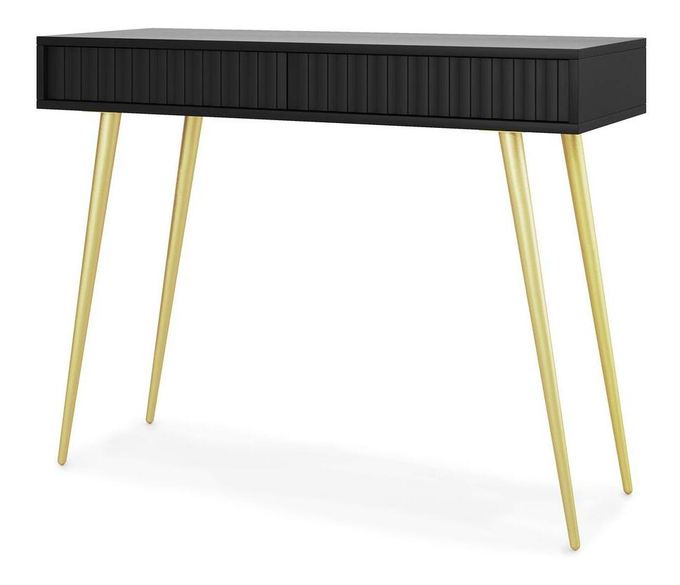 MutasdOlyan bútorokat keres, amelyek segítségével egyedi teret rendezhet be, mint egy lakberendező magazinból? A fésülködőasztallal gyorsan és egyszerűen a felismerhetetlenségig megváltoztathatja nappaliját! A fésülködőasztal egyedi design és funkcionalitás egyben. Az aranyszínű, keskeny lábakon lévő egyszerű formát elöl divatos lécek gazdagítják, aminek köszönhetően az egész nagyon stílusosnak tűnik. Sikeresen illeszkedik a modern, minimalista és ipari stílusban berendezett belső terekbe, ahol kétségtelenül a szoba dekorációja lesz. A fésülködőasztal előnye a két fiók, amely lehetővé teszi, hogy elrejtse személyes dolgait a vendégek szeme elől, míg a tágas munkalap remek hely egy virágváza vagy stílusos kiegészítők kihelyezésére. Termék részletek: a ház 16 mm-es laminált forgácslapból készült, mely nedvesség- és karcállóságának köszönhetően biztosítja a hosszú távú használatot, a magas lábak könnyítik a bútort és megkönnyítik a rendben tartást, a bútor szélei ABS élekkel vannak megerősítve, a bútor saját kezűleg is összeállítható.