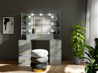 A fésülködőasztalhoz egy szék is tartozik. Önön múlik, hogy melyik típust választja – elegendő-e egy zsámoly, egy dizájnos kárpitozott fotel vagy egy háttámlás fotel. Kész készleteket is kínálunk, köztük olyat is, amelyhez egy szék is tartozik. A fésülködőasztal legfontosabb része kétségtelenül egy nagy tükör. Az azstal nem lenne teljes nélküle. A széles választékból többféle méret közül választhat. A nagyobb tükrök praktikusabbak, mert a teljes outfitjét is ellenőrizheti bennük. Javasoljuk, hogy kiegészítse kisebb tükrökkel az oldalakon. A világítás is nagyon szorosan kapcsolódik ehhez. Különbség van a smink felvitele között gyenge fürdőszobai világításnál és természetes fényben, ahol minden tökéletlenség látható. Ha van rá lehetősége, helyezze az asztalt az ablak mellé, és adjon hozzá egy asztali lámpát. Mivel ez állítólag egy kis paradicsomi darab, kényeztesse magát friss virágokkal, fotóval vagy egyéb díszítéssel az asztalon, amely mindig mosolyt csal az arcára