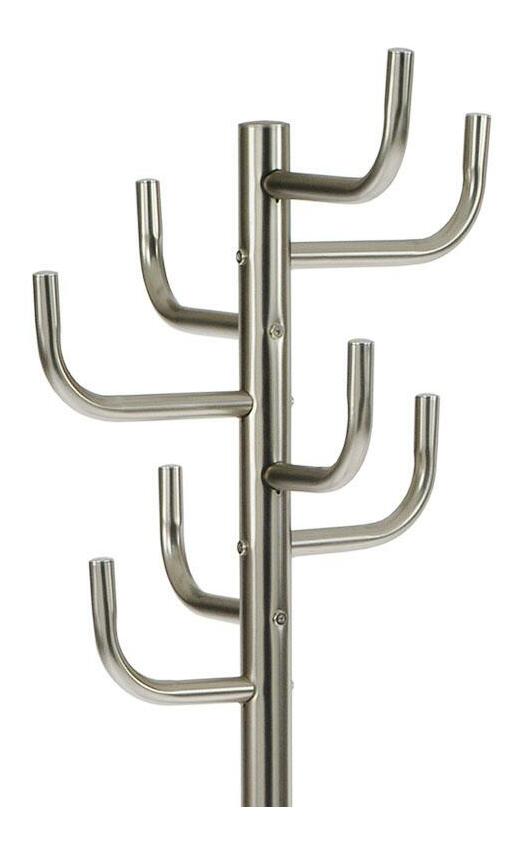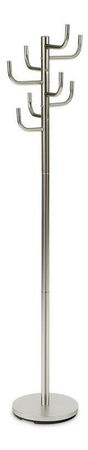 MutasdFém, szabadon álló kabáttartó modern stílusban, különböző magasságú nagy akasztókkal. A kampók lekerekített kupakkal vannak ellátva a szerkezet dekorjában. A stabil és könnyű szerkezet szálcsiszolt nikkel díszített fémcsövekből készült, és egy fém platformmal, valamint súllyal ellátott, műanyag tokban végződik. A teljes kabáttartó kiváló minőségű átlátszó lakkal van festve a dekoráció felületvédelme érdekében. Szétszerelt állapotban szállítjuk. Magassága 175 cm, teljes teherbírása legfeljebb 10 kg egyenletesen elosztott terhelés. Súlyának és kialakításának köszönhetően könnyen hordozható. Ez egy nagyon funkcionális belső kiegészítő, amely mindenkiben megtalálja a megérdemelt helyet és alkalmazást.