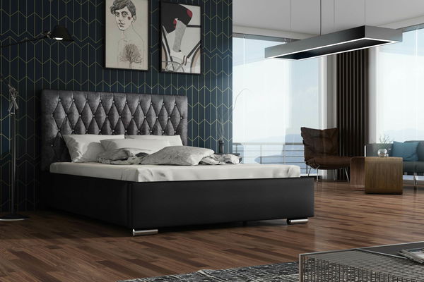 Elegáns Saturio franciaágy dísz varrással a fejtámlán. Gyönyörű romantikus környezetet alakít ki a hálószobájában. Az ágy jellemzői a magas homlokzat és széles henger alakú fém lábak.