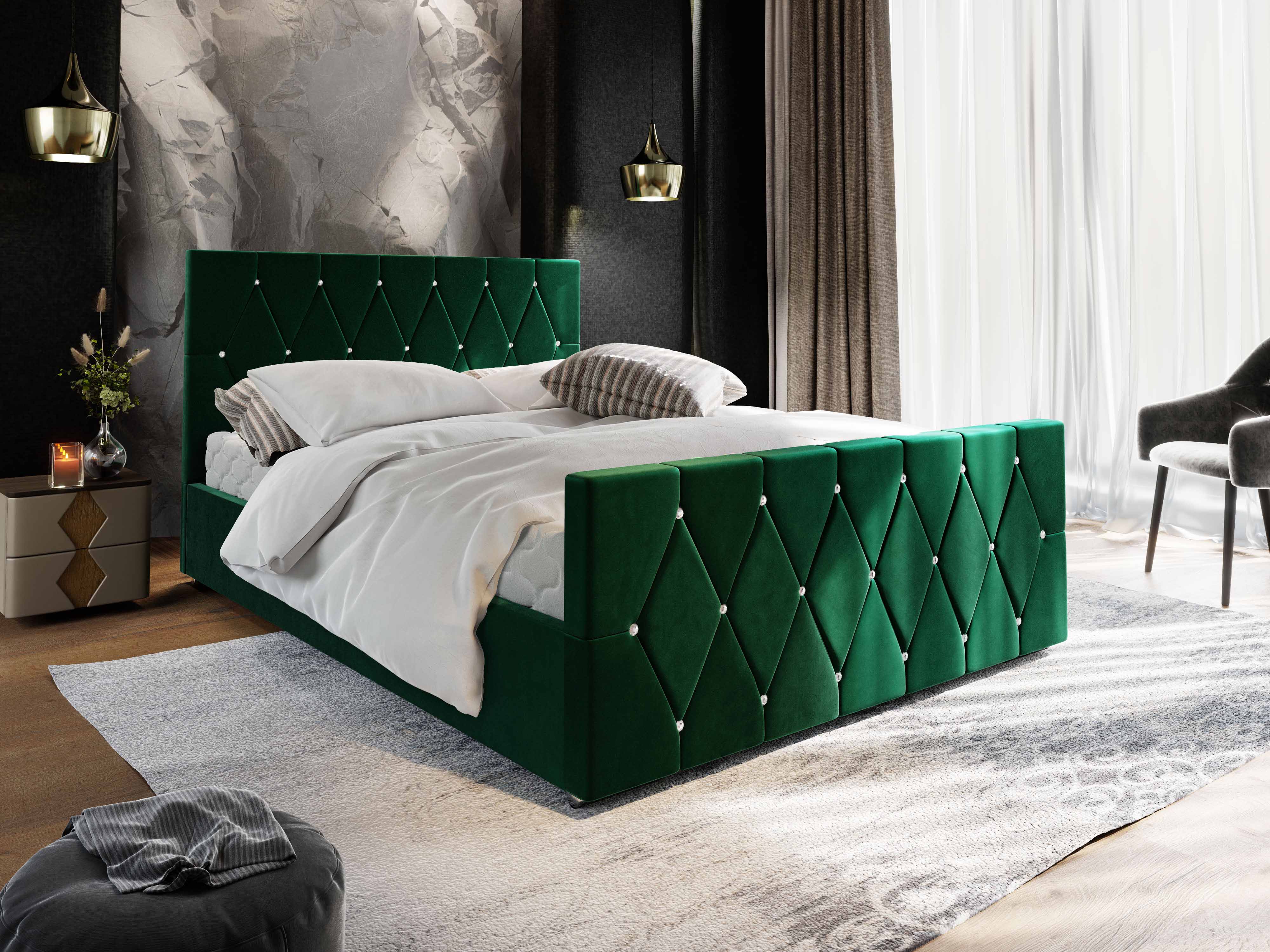 Franciaágy 140 cm Illa (sötétzöld) (ágyráccsal és tárolóhellyel)