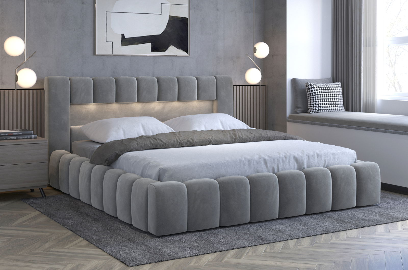 Franciaágy 140 cm Luxa (szürke) (ágyráccal, matraccal és LED-del)