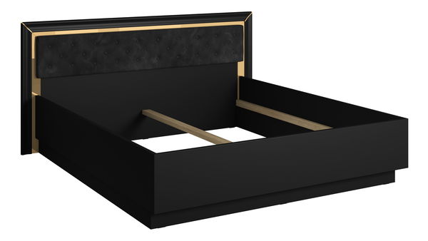 Ez a franciaágy a modern dizájn és a minőségi kidolgozás kombinációját kínálja, ideális a kényelmes alváshoz. Tartós laminált forgácslapból készült, ABS élekkel, hosszú élettartamot és kopásállóságot garantál. Az ágy léc és matrac nélkül érkezik, így kiválaszthatja az igényeinek leginkább megfelelőt. A 200x180 cm-es felület elegendő helyet biztosít két személy kényelmes alvásához. A fejtámla elegáns arany szegélye stílusos megjelenést kölcsönöz az ágynak, amely minden modern enteriőrbe illeszkedik.