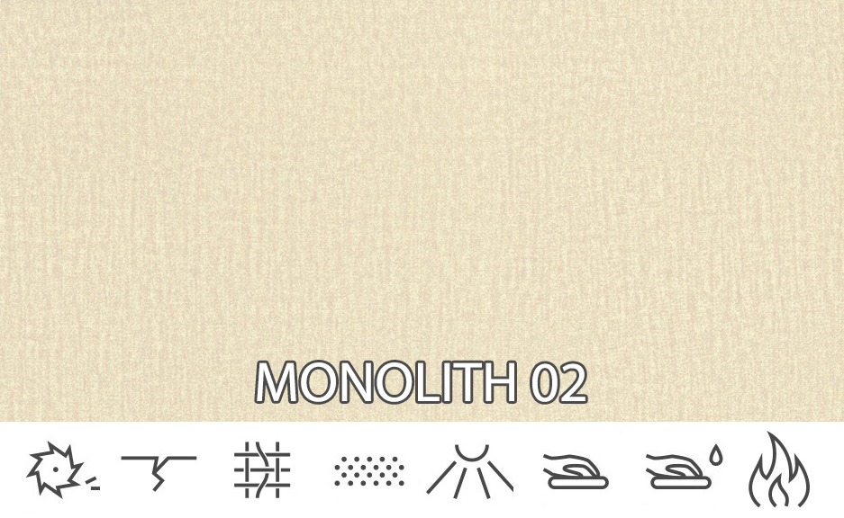 A Monolith egy strapabíró plüss anyag, amely kellemes tapintású. Egy speciális védőréteg borítja, amely hidrofób réteget hoz létre, amely megvédi a kiömlött folyadékok gyors felszívódását. Nagyon ellenáll a kifakulásnak és a foltosodásnak. A szövetet árnyékoló anyag jellemzi. Kárpitápoló szerekkel tisztítható. Nem szabad fehéríteni vagy túl magas hőmérsékletnek kitenni – ne szárítsa a szárítóban.