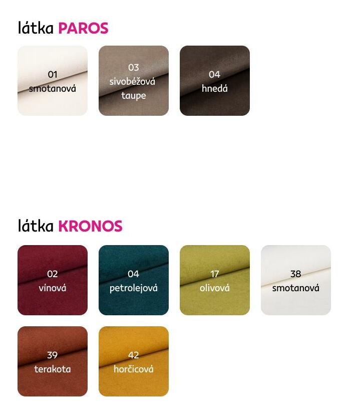 A Kronos nevű plüss anyag intenzív, merész színek gazdag palettáját kínálja, amelyek fényűző és szemet gyönyörködtető megjelenést kölcsönöznek a bútoroknak. Ez az anyag különösen népszerű a kárpitozott bútorok területén, ahol puhasága és kényelme miatt használják. Tartóssága és kiváló minősége biztosítja, hogy a bútorok sok éven át szépek és funkcionálisak maradjanak.