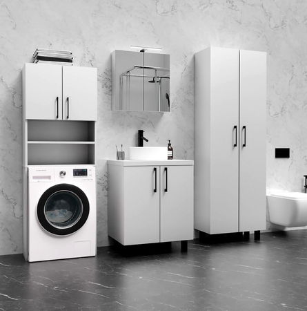Az elegáns fehér dizájnú Valiant 3 fürdőszoba a letisztult dizájnt praktikus tárolási megoldásokkal ötvözi, amelyek kiemelik a szoba rendjét és fényességét. Ez a készlet tartalmaz egy magas szekrényt, egy fürdőszobai szekrényt, egy mosógép szekrényt és egy függesztett fürdőszobai szekrényt, amelyek bőséges helyet biztosítanak minden fürdőszobai kelléknek. A fehér matt felület optikai könnyedséget kölcsönöz a fürdőszobának, míg az átgondolt kialakítás maximális funkcionalitást és a rendelkezésre álló tér hatékony kihasználását teszi lehetővé. Ez a bútor rendezett és stílusos térré varázsolja a fürdőszobát.