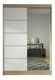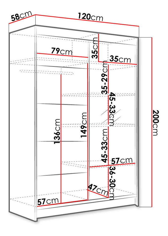 16 mm vastag laminált lap, élei ABS furnérral, tolóajtó rendszerrel, elöl tükör, kilincs alumínium szalag formájú, ajtó mentén, alumínium kilincsek megakadályozzák az ajtó elhajlását, a szekrény fel van szerelve tágas polcok, RGB LED világítás kiegészítő opcióként felár ellenében (15 változó szín + távirányító)