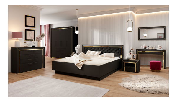 Az Arnol 1 hálószobás szett fekete változata elegáns és időtlen megjelenésű, hangulatos, enyhén drámai környezetet teremtve, amely alkalmas pihenésre és regenerálódásra. A mély árnyalat, az egyszerű vonalak és a fényes részletek kombinációja stílusos és modern hatást kelt. A vizuális benyomást átgondolt tárolási megoldások egészítik ki gardróbszekrény, komód és éjjeliszekrény formájában, amelyek megkönnyítik a mindennapi dolgok rendszerezését. Az összhatás a jellegzetes megjelenést ötvözi a praktikus használhatósággal bármilyen típusú hálószobában.