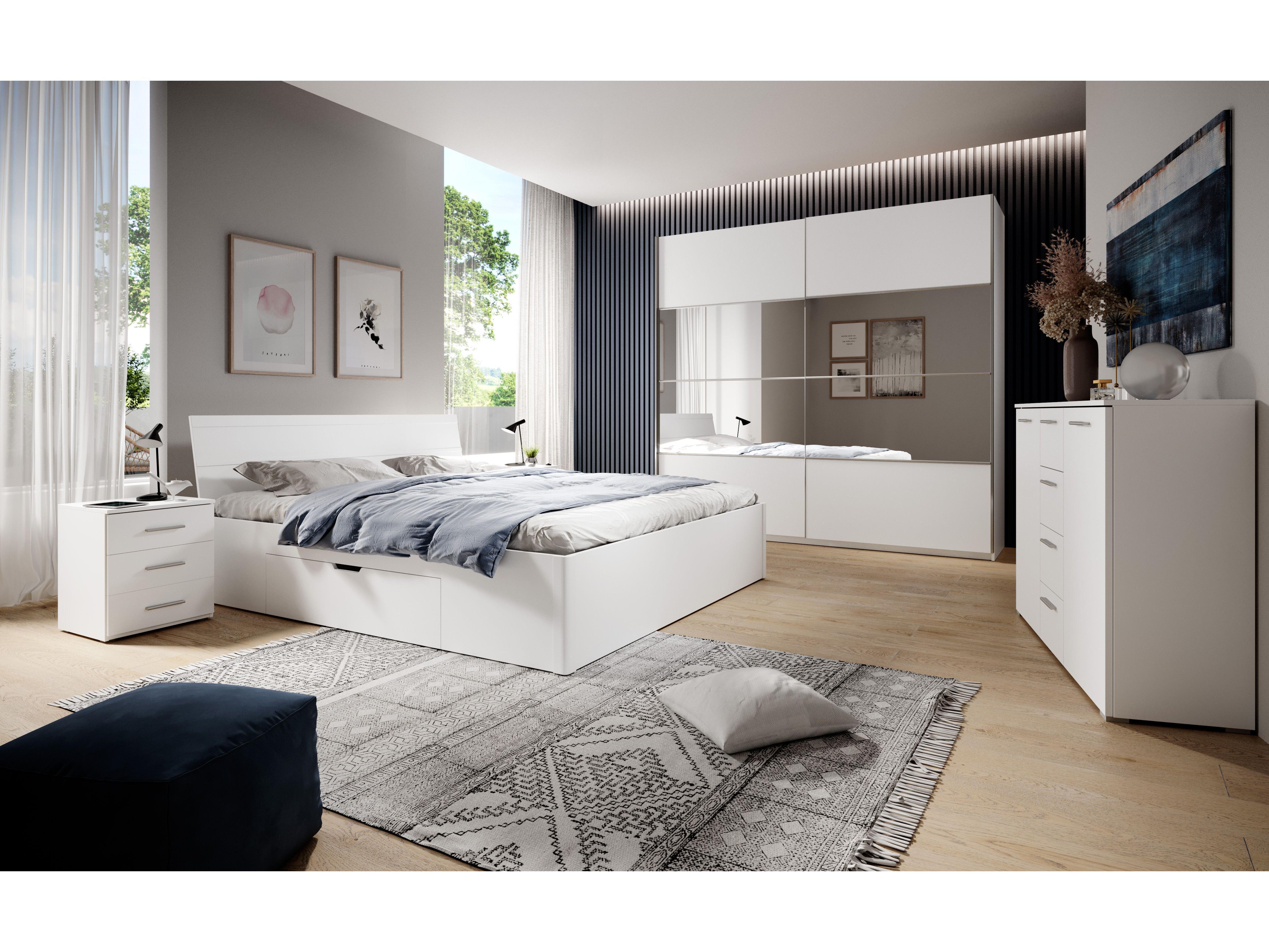 A fehér hálószoba frissességet és tisztaságot hoz a belső térbe, optikailag megnöveli a teret, és békés légkört teremt, amely ideális a kikapcsolódáshoz. A sima felületek és a minimalista vonalak hangsúlyozzák a modern dizájnt, míg a praktikus tárolási megoldások, mint például a tágas gardróbszekrény, rendet és átláthatóságot biztosítanak. A kiváló minőségű anyagok és a precíz kidolgozás hosszú élettartamot és egyszerű karbantartást garantál. Ez a szett ideális választás azok számára, akik a funkcionalitás és az esztétikus megjelenés kombinációját keresik hálószobájukban.