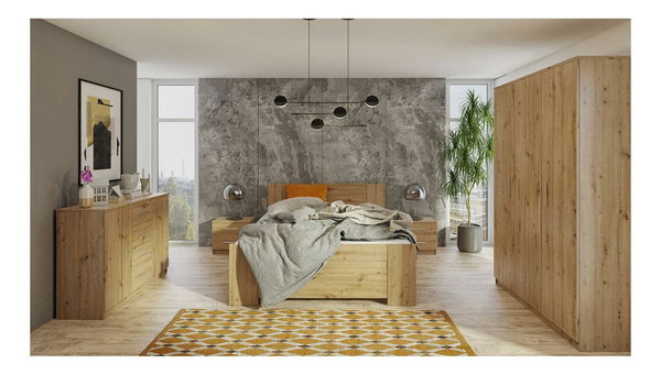 Képzeljen el egy hálószobát, ahol minden részlet tükrözi az ízlését és a kényelem iránti vágyát. A Bonaparte 3 hálószobás, artisan tölgyfa dekorációjú garnitúra meleg és természetes hangulatot kölcsönöz otthonának, hangulatos légkört teremtve, amely ideális a kikapcsolódáshoz. A domináns jellemző a ágyráccsal ellátott franciaágy, amely garantálja a minőségi alvást, míg a tágas gardrób és a praktikus fiókos szekrény rengeteg helyet biztosít a személyes tárgyaknak. Két éjjeliszekrény teszi teljessé a szettet, melyek helyet biztosítanak kedvenc könyveidnek vagy egy lámpának. Ez a hálószoba nem csupán egy hely az alvásra, hanem a személyes szentélyeddé válik, ahol minden nap a megelégedettség és a harmónia érzésével kezdődik és végződik.