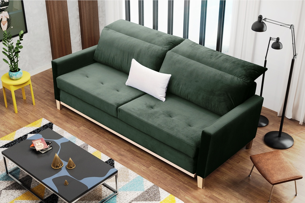 Elegáns Alva kanapé favázon, nappaliba és irodába is alkalmas. Tárolóhelyet és helyet kínál az alkalmi alváshoz. Különböző színváltozatokban kapható.