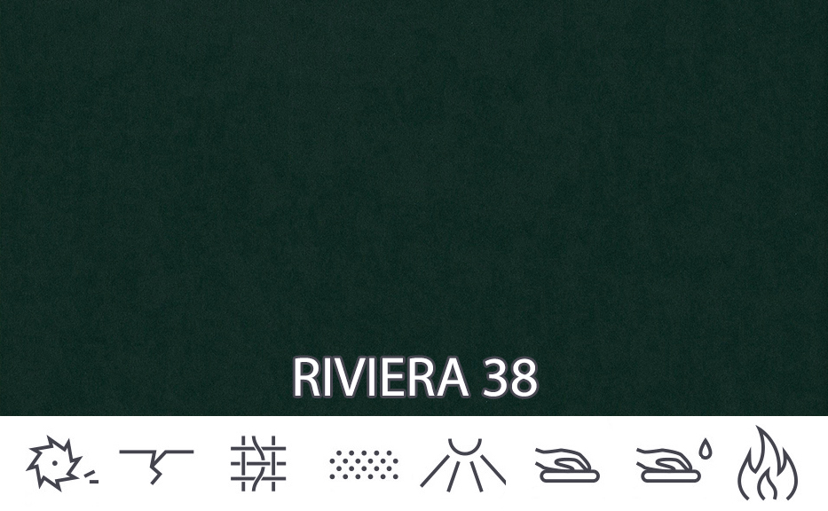 A Riviera egy plüss szövet, amelyet nagy kopásállóság és foltosodási ellenállás jellemez. A napfénynek ellenálló anyagok csoportjába tartozik – nem fakul. A tisztításhoz ajánlott a kárpitozott bútorokhoz készült speciális eszközök használata. Ne mossa nedvesen, ne klórozzon, ne tisztítsa szárazon vagy szárítógépben. Csak alacsony hőmérsékleten vasalható.