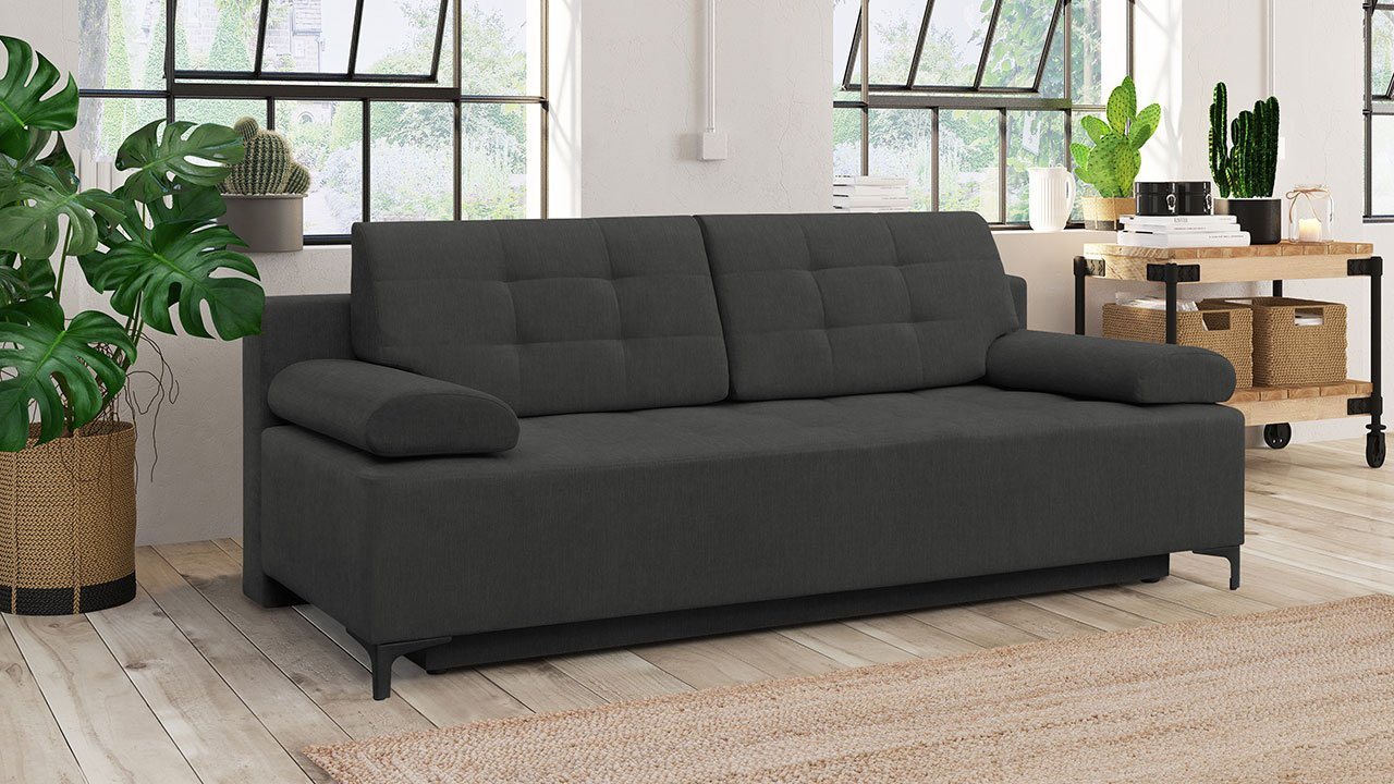 Szeretne elegáns teret, ahol családja kényelmesen pihenhet? A háromszemélyes kanapé tökéletes választás, amely varázslatos kompozíciót hoz létre nappalijában, ifjúsági szobájában vagy vendégszobájában. A kanapé finoman ívelt vonalvezetése eleganciát sugároz, miközben könnyed megjelenésével ideális kis helyiségekbe is. A tartós kárpit szín jól illik modern, boho vagy skandináv stílusú belső terekhez. A poliuretán habbal töltött ülőfelület kényelmet és megfelelő támaszt nyújt a gerinc érzékeny pontjainak. A kanapé praktikus tárolóhellyel rendelkezik ágyneműk számára és intuitív DL alvó funkcióval, amely automatikusan működik. Termék részletei: Független modell (kárpitozott háttámla). Könnyen használható DL alvó funkció. Praktikus tárolóhely ágyneműknek. Erősített varrás a párnákon. Kárpit: Amon 13, fekete színben, finom fényű bársony, WATER STOP technológiával a könnyű tisztíthatóságért