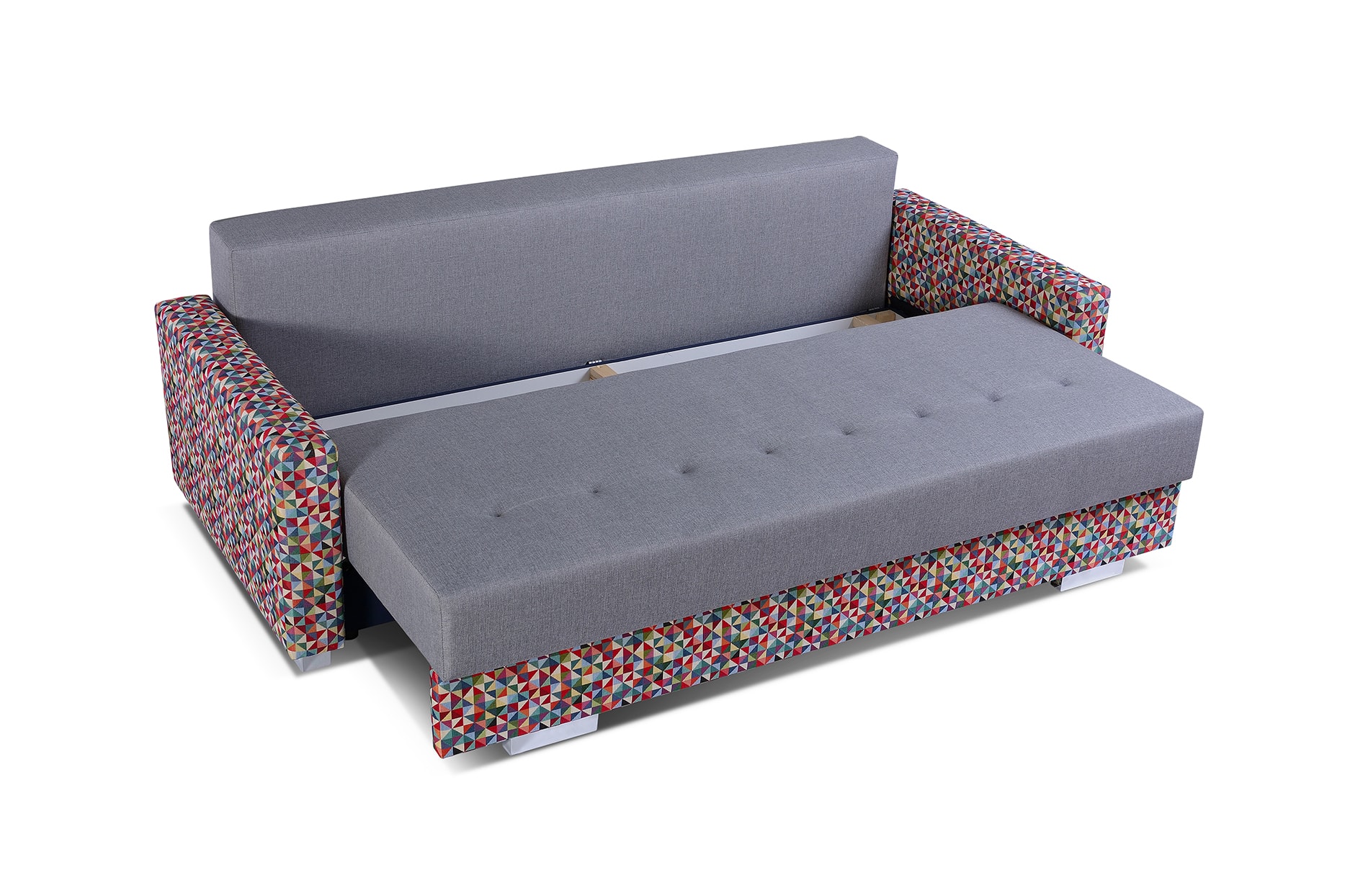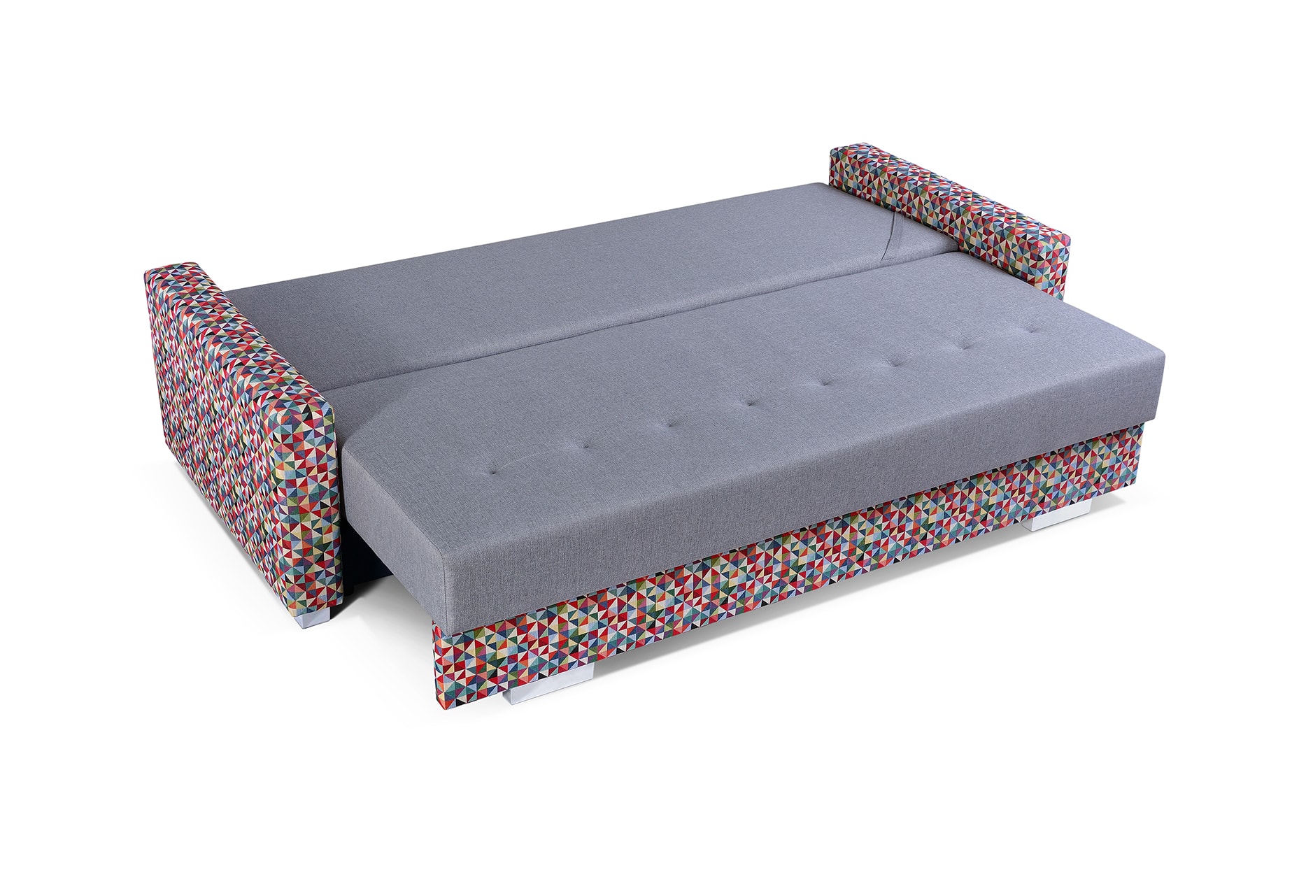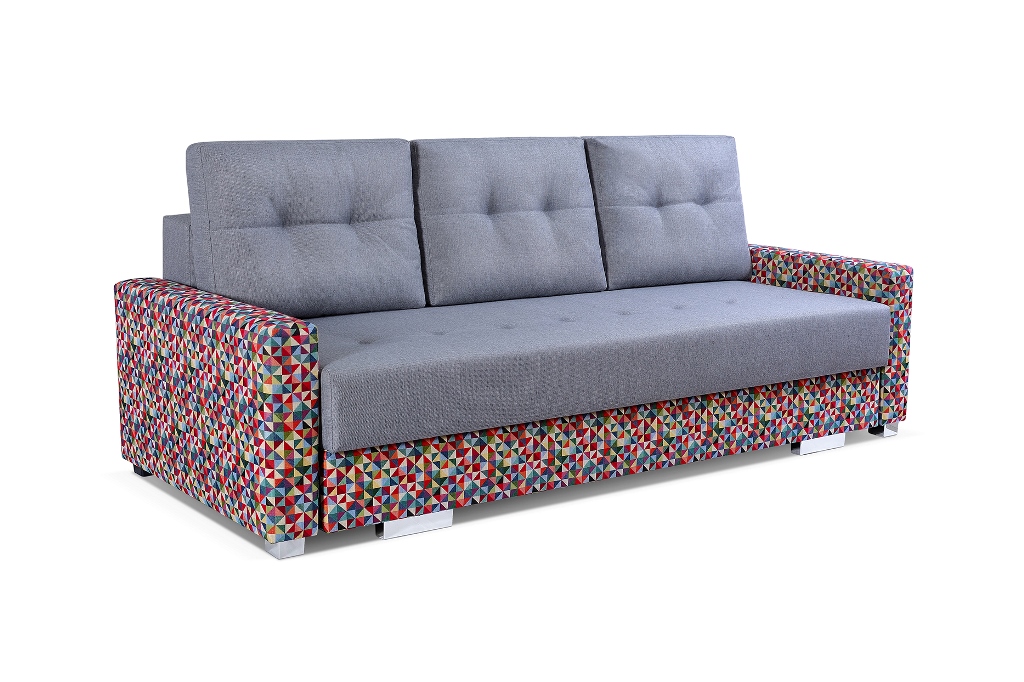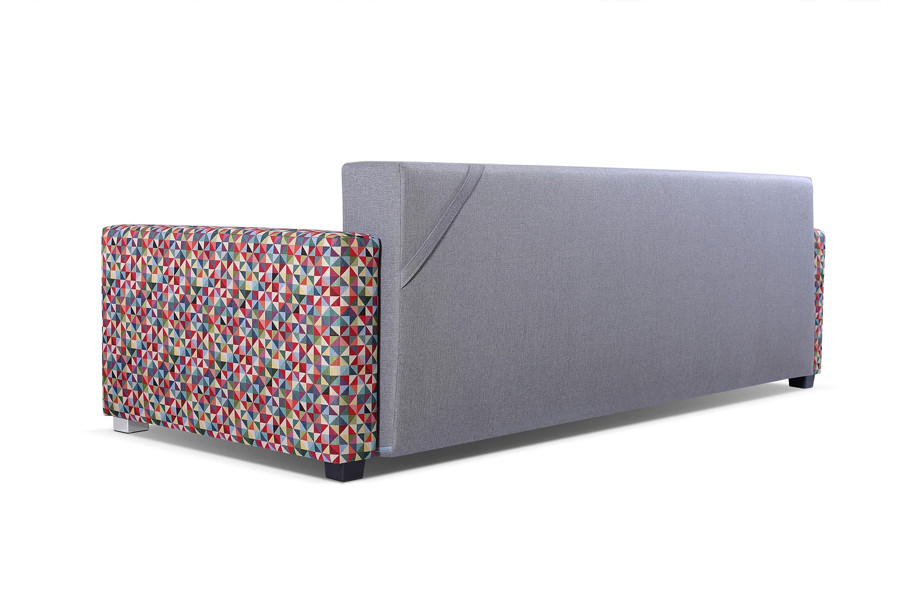 Modern Sam kanapé színes geometrikus elemekkel az oldalán és alján. A színes elemek játékosságot adnak a kanapénak.