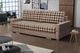MutasdA bézs színű mintás kanapé alkalmas nappaliba, gyerekszobába vagy vendégszobába. Kinyitva 197 x 147 cm-es hálófelületet és tárolóhelyet kap az ágyneműk számára.