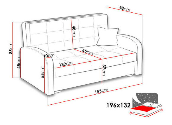 hosszúság: 153 cm, szélesség: 98 cm, magasság: 85 cm, fekvőfelület: 196 x 132 cm