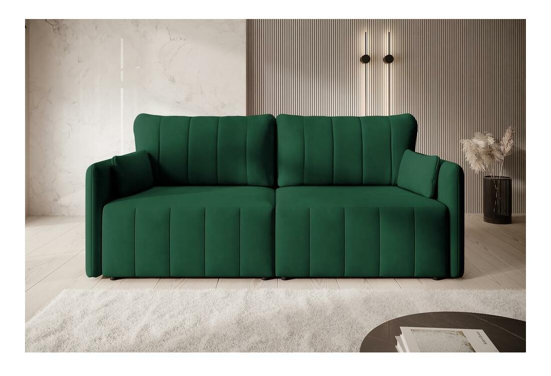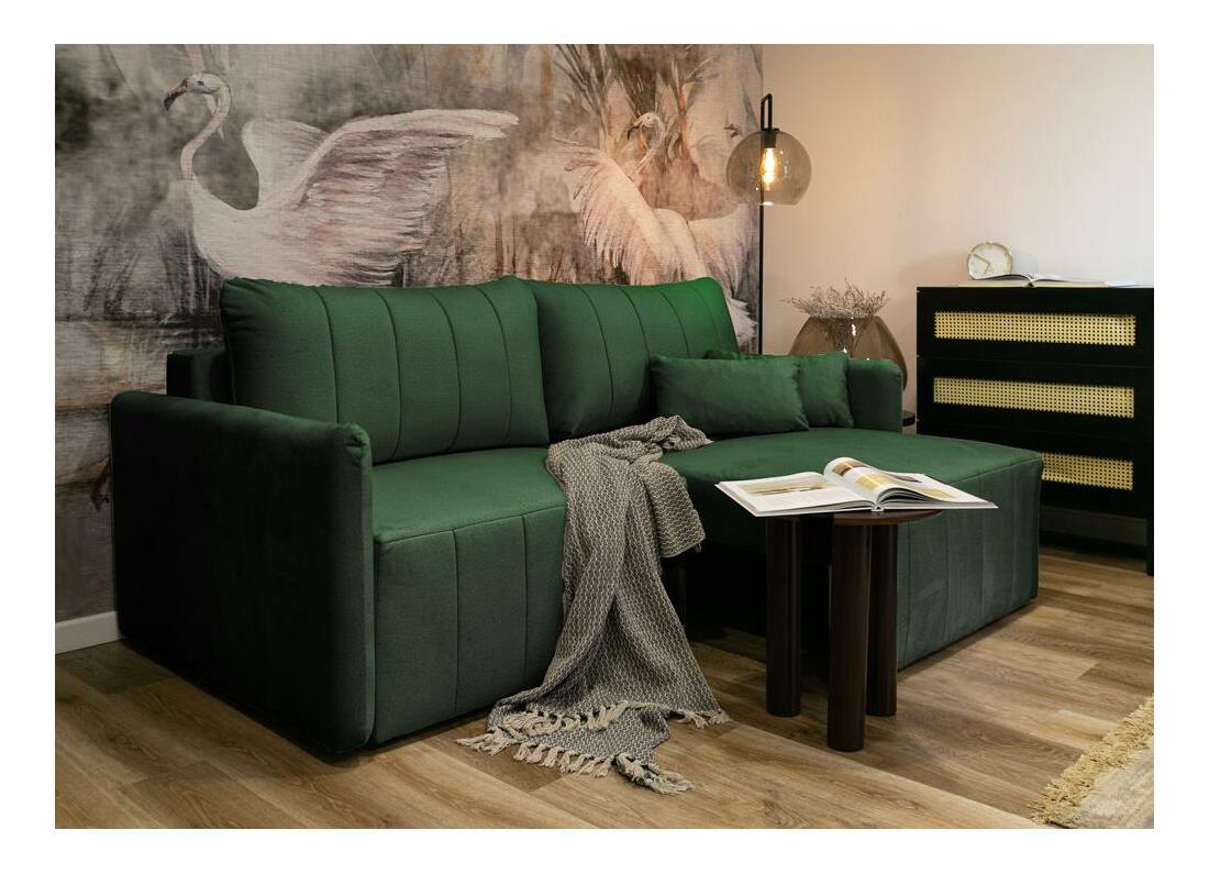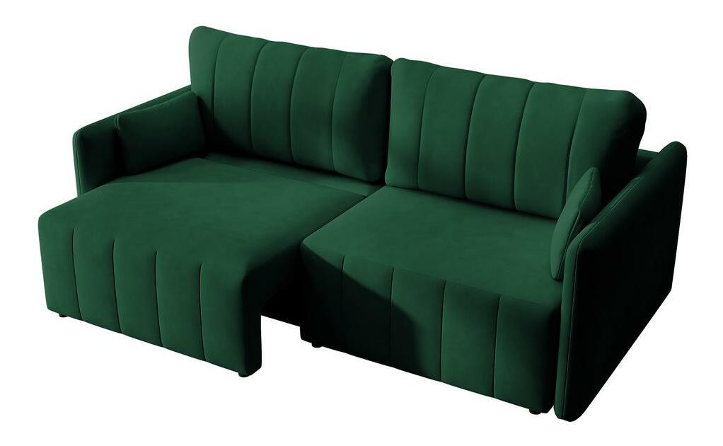 MutasdEz az átalakítható kanapé esztétikus és praktikus, kompakt méreteinek köszönhetően pedig a legkisebb nappaliba is befér. A kanapé multifunkcionális, lehet hagyományos kanapé, sarokkanapé vagy kényelmes ágy. Modern kialakításának köszönhetően könnyedén átalakítható bal vagy jobb oldali sarokkanapévá, és gyorsan kinyitható alvófunkcióval is rendelkezik, amely ideális vendégek fogadásakor. Emellett praktikus tárolóhelyet is biztosít az ágyneműk számára. A kanapé tartós, sötétzöld Element 12 bársonyszövettel van kárpitozva, amely kopásálló, vízlepergető és tűzálló.