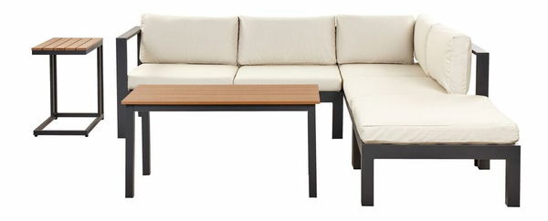1 x sarokrész, 1 x zsámoly, 1 x asztal, 1 x kézi asztal, 5 x ülőpárna, 5 x párna, 1 x párnahuzat készlet