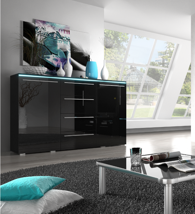 Komód jobb és bal oldalon ajtókkal, középen négy fiókkal. A bútorokhoz többszínű RGB LED világítást rögzíthet. Ez a fajta világítás több világos árnyalatot és színt kínál. Modern világos bútorok otthonába vagy az irodájába az Alyce sorozatból.