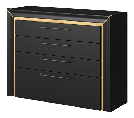 Ez a stílusos komód ideális tárolási megoldás minden modern belső térben. Kiváló minőségű laminált forgácslapból készült ABS élekkel, ellenálló és tartós. Az ajtót kiváló minőségű fólia borítja, amely elegáns megjelenést és egyszerű karbantartást kölcsönöz a felületnek. A komód négy tágas fiókkal van felszerelve, amelyek elegendő helyet biztosítanak különféle tárgyak tárolására. A fém arany fogantyúk és az arany szegélyek modern és kifinomult megjelenést kölcsönöznek a komódnak, így vonzó eleme otthonának.
