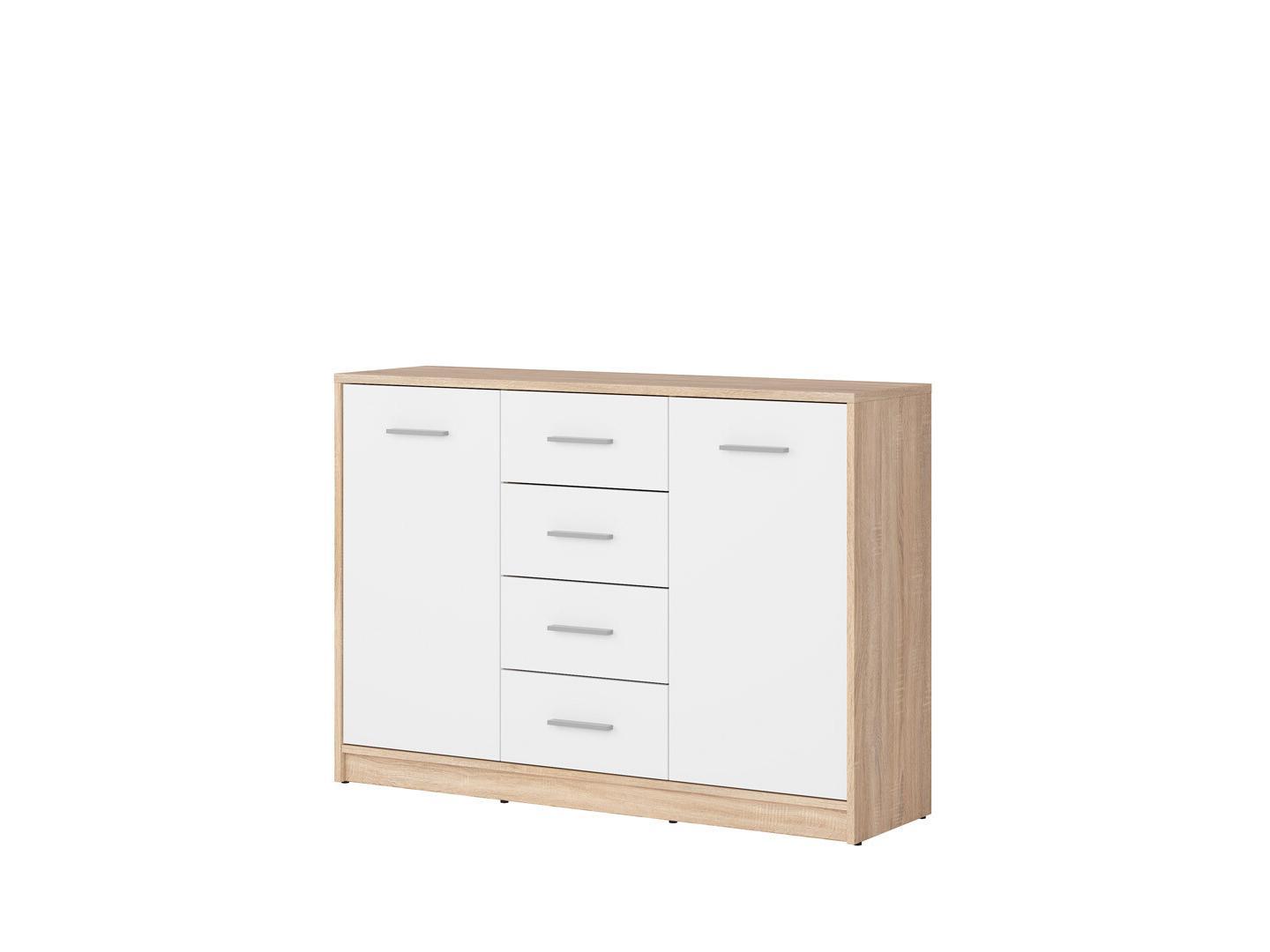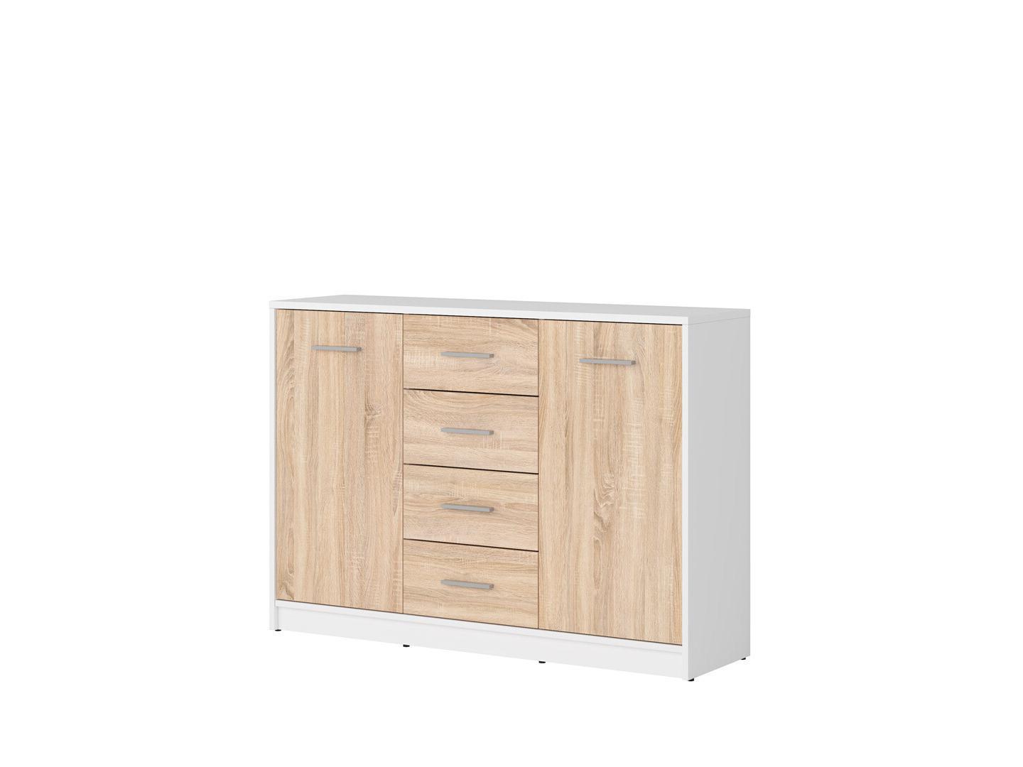 Modern dizájn, gyönyörű színvilág, praktikus tárolóhely - ez a háromrészes fiókos szekrény mindezt kínálja. A fiókos szekrény bal és jobb oldalán szekrények találhatók. Minden szekrényt egy polc oszt két tárolórekeszre. A fiókos szekrény közepén két sekély és két mélyebb fiók található.