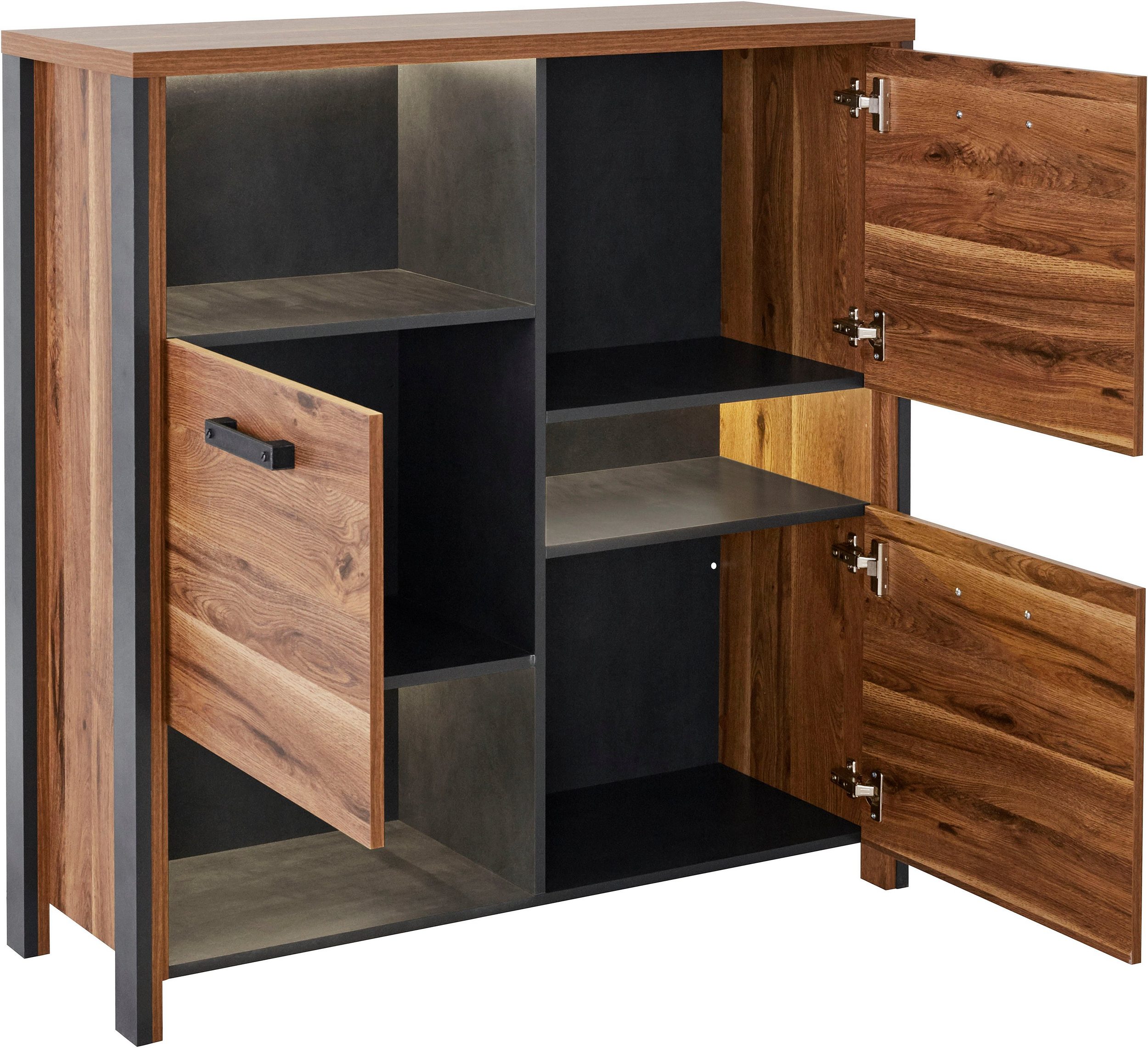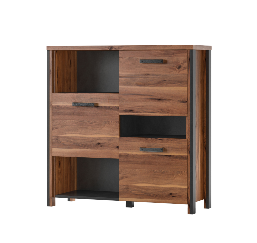 Masszív komód a Buena sorozatból. Tökéletes a nappaliba és az irodába. A LED világítás hozzávásárolható.