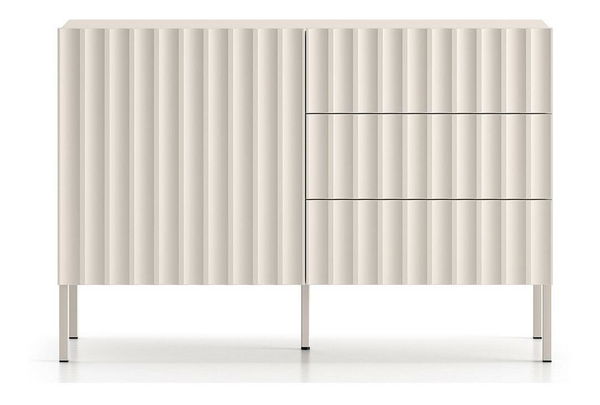 MutasdEgyedi, modern és egyben funkcionális bútorokat keres belső terébe? A kollekció minden elvárásnak megfelel. Az egyedi kialakítású komód tökéletesen illeszkedik a modern és minimalista belső terekbe. A világos bézs szín gyengéd varázst kölcsönöz neki, amely tökéletesen illeszkedik a legtöbb elrendezéshez. Az egész kollekciót kifinomult részlet jellemzi a barázdált elülső részek formájában, amelyek minden helyiségnek egyedi megjelenést kölcsönöznek. A funkcionalitást szem előtt tartva tervezték, három tágas fiókkal és két polccal rendelkezik, ahol könnyedén elhelyezhet különféle tárgyakat igényei szerint. Ha a korpuszt stabil fa lábakra helyezzük a bútor színében, az egész könnyűnek és nagyon stílusosnak tűnik. A kollekció nem csak praktikus tárolási megoldás, hanem olyan dizájnelem is, amely minden helyiség egyedi stílusát hangsúlyozza. Ne várjon, és vezessen egyedi karaktert belső terébe még ma. Termék részletek: Koprusz laminált lapból Cashmere U12168VV - PFL 16 mm, előlapok MDF lapból NL7393 CASHMERE SERICA 18 mm, zsanérok lágy zárás funkcióval, belül fém lábak! Korpusz színe, nyitható fióknyílás, előlapok 7 mm-rel az asztallap fölé nyúlnak, melamin élek mechanikai sérülésekkel szemben, középső/támasztó lábak magasságállító funkcióval, hátfal fehér HDF-ből, szín: világos bézs.