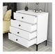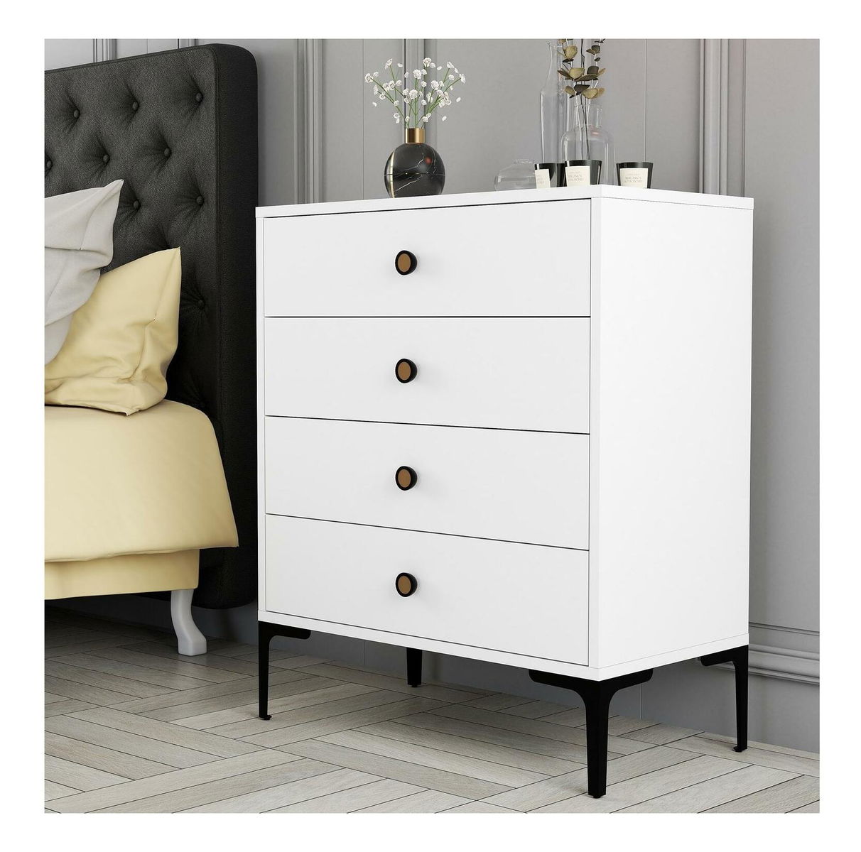 Vastagság: 18 mm. Műanyag fogantyú. Fém lábak. Komód méretei: Szélesség: 76 cm. Magasság: 90,7 cm. Mélység: 40 cm. 4 fiók. Lábak magassága: 17,8 cm