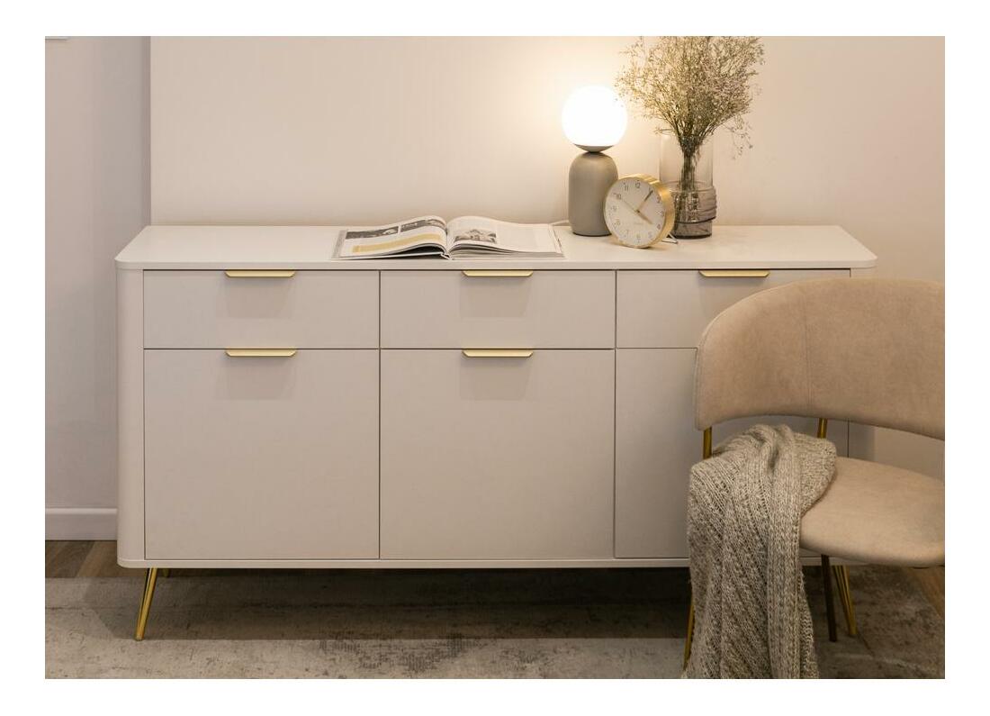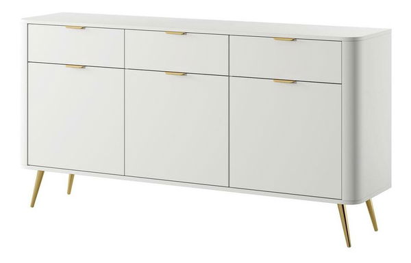 MutasdUnja a klasszikus bútorformákat? Szeretne lakást cserélni? Válasszon egy kollekciót, és lepje meg minden vendégét. A komód egy modern bútor, amely meglep a formájával. A lekerekített élek eleganciát adnak, és gyermekek számára is alkalmasak. A komódban három fiók és három zárt szekrény található, amelyeket egy polc oszt el. Ez az elrendezés biztosítja a bútorok maximális funkcionalitását, mivel kis kiegészítők és nagyobb tárgyak is elférnek benne. További előnye az asztallap, ahol a szerettei fotóit vagy az emléktárgyakat megjelenítheti. A bútor a hálószobában is kiválóan használható ruhaszekrényként vagy pótágynemű garnitúraként. A termék részletei: a korpusz és az előlapok Kronospan 6459 SM laminált bútorlapból készültek Platinum White színben, ABS élekkel megerősítve, amelyek stabilitást és stabilitást biztosítanak.Tartósság, magas acéllábak króm arany színben, kis fehér csúszkákkal, amelyek megakadályozzák a padló megkarcolását, 27 mm-es golyós vezetőkön található fiókok, finom arany, csiszolt fogantyúk funkcionalitást adnak a termékenk.