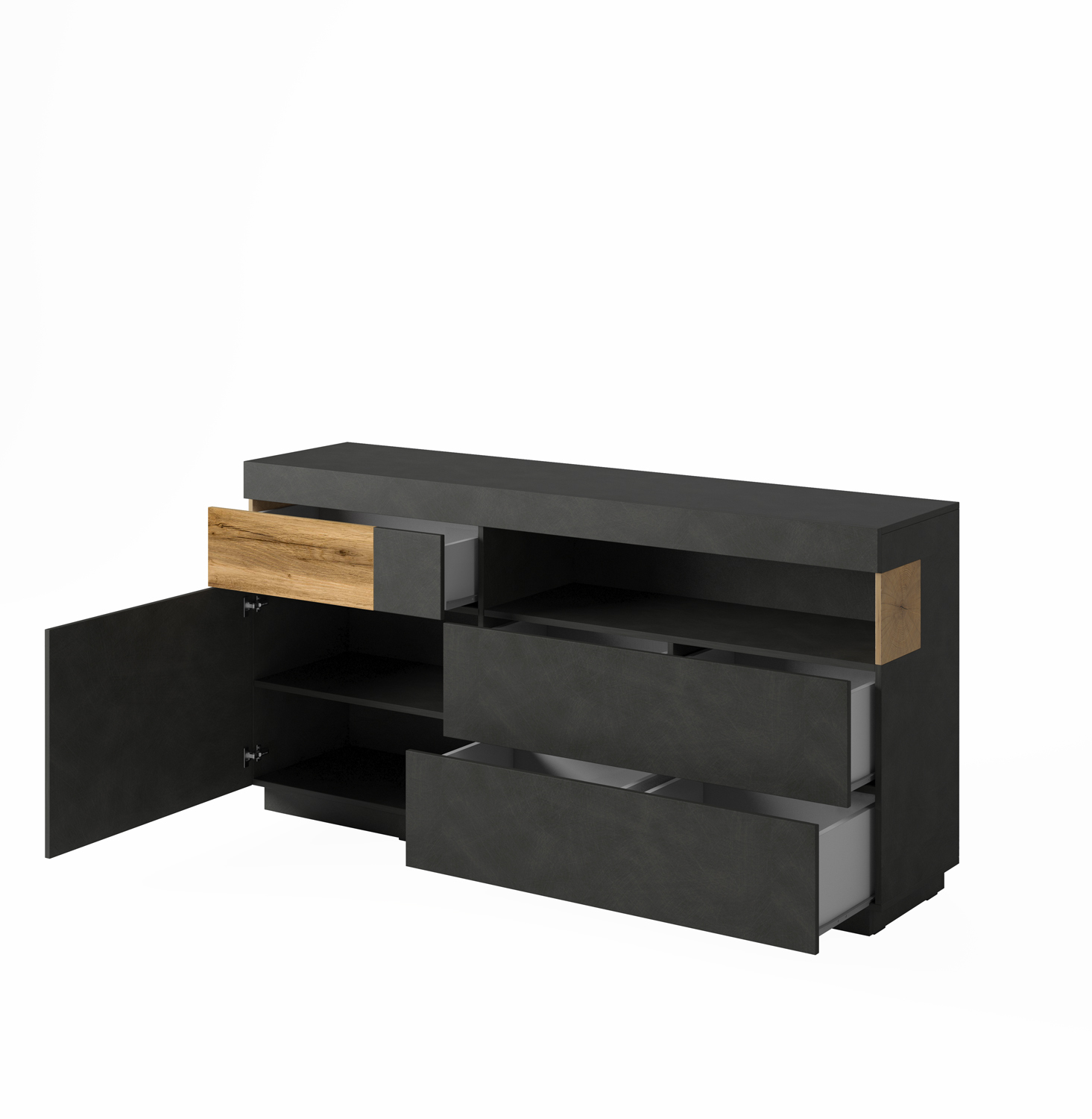 Komód ajtókkal és fiókokkal. A felső részben nyitott tér található. A Stacey bútorok rengeteg tárolóhelyet kínálnak polcok formájában.