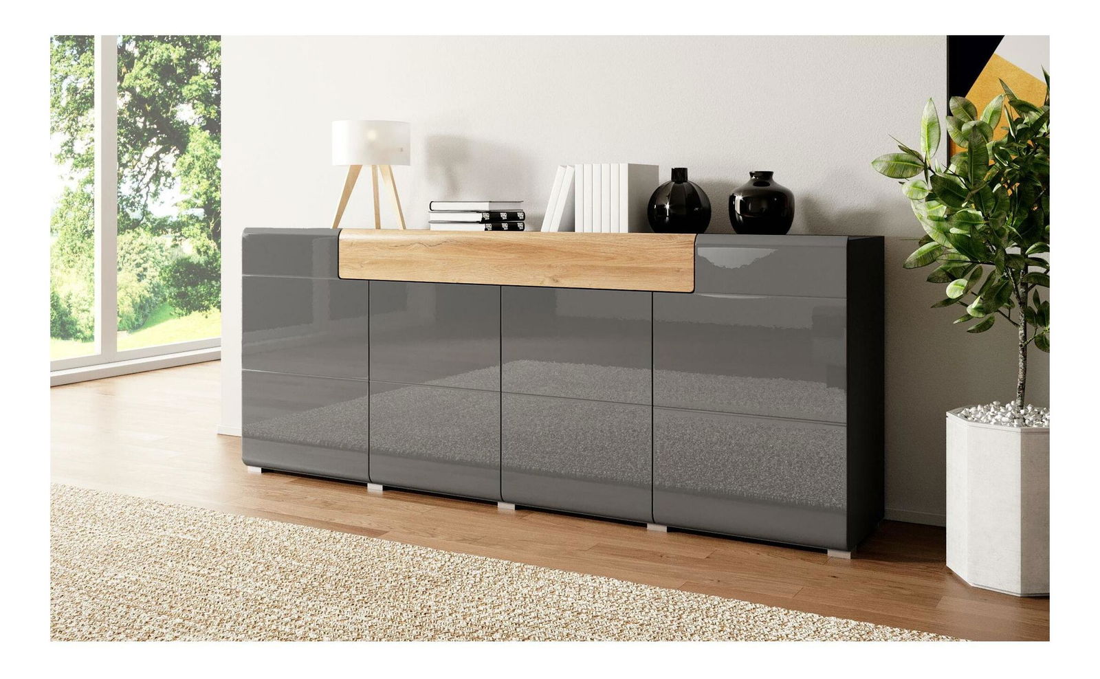 Elegáns, ajtókkal, polcokkal és fiókokkal felszerelt komód a Tamie sorozatból. A Tamie sorozat kivételes bútordarabja eleganciát varázsol minden nappaliba és irodába.
